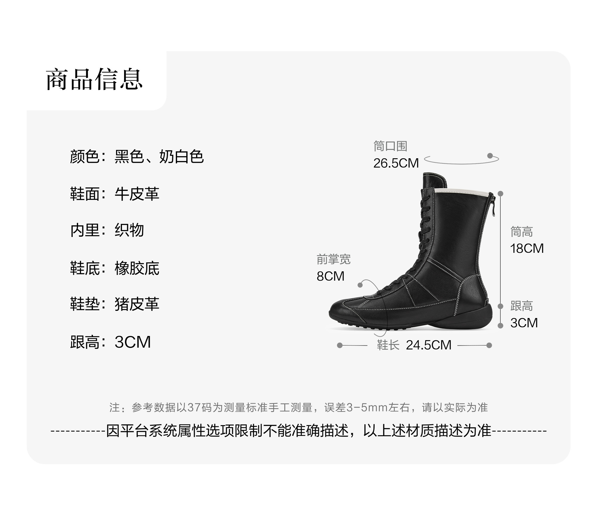 | 筒高数值:18CM | 性别:女子 | 靴筒筒面材质:牛皮革 | 里料材质:织物 | 鞋垫材质:猪皮革 |