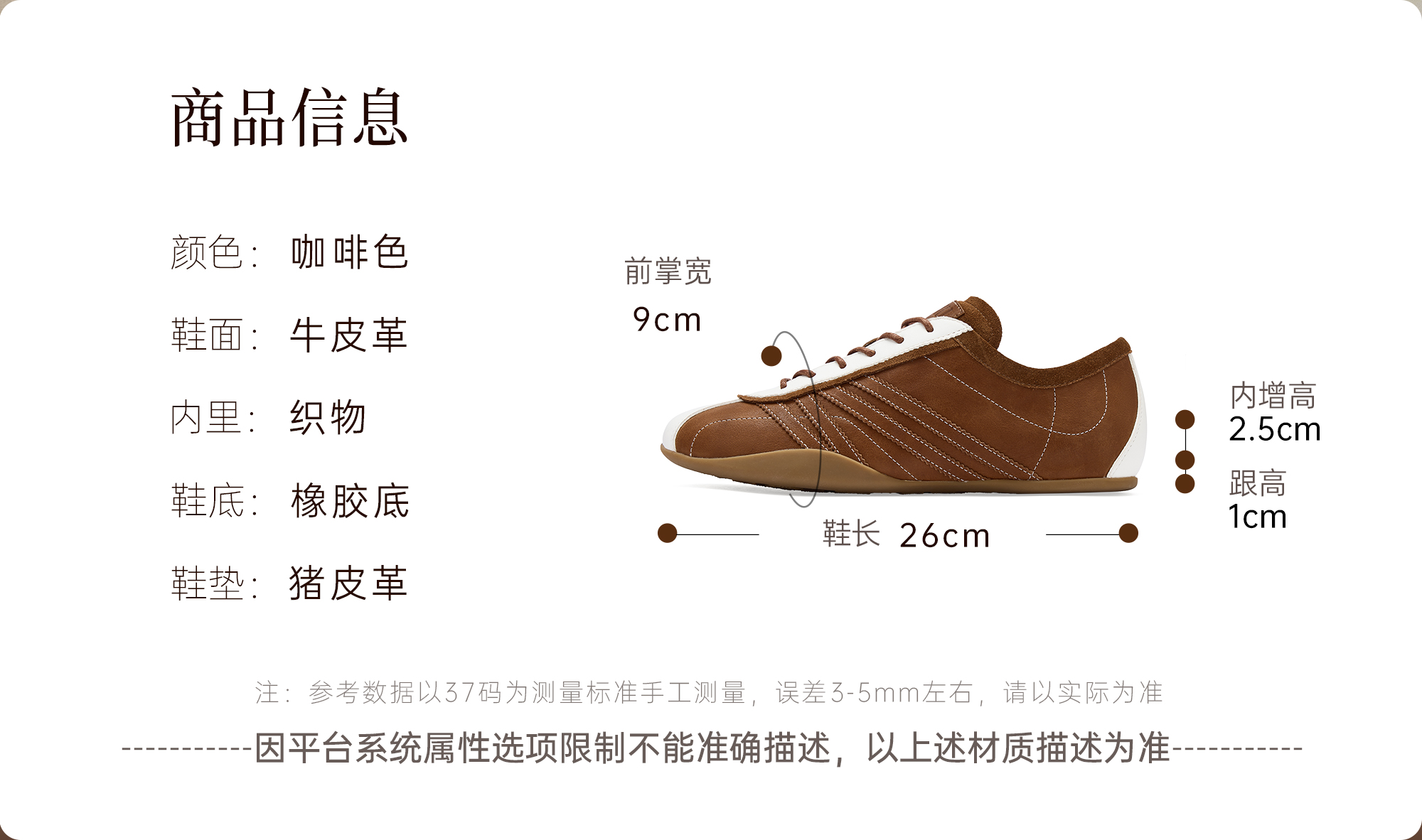 | 鞋面内里材质:织物 | 色系:咖啡色 | 跟高数值:1CM | 适用人群:女子 | 性别:女子 |