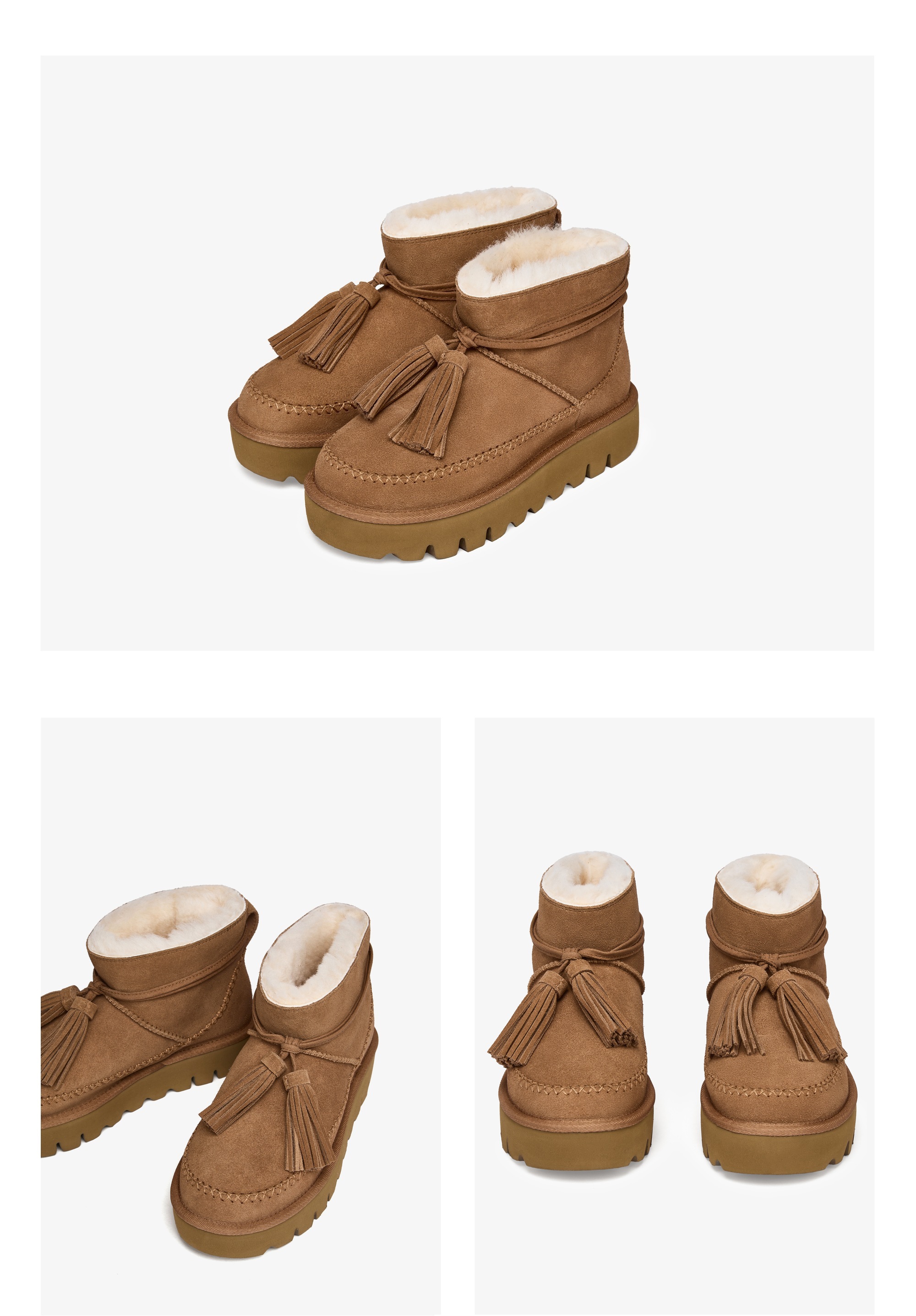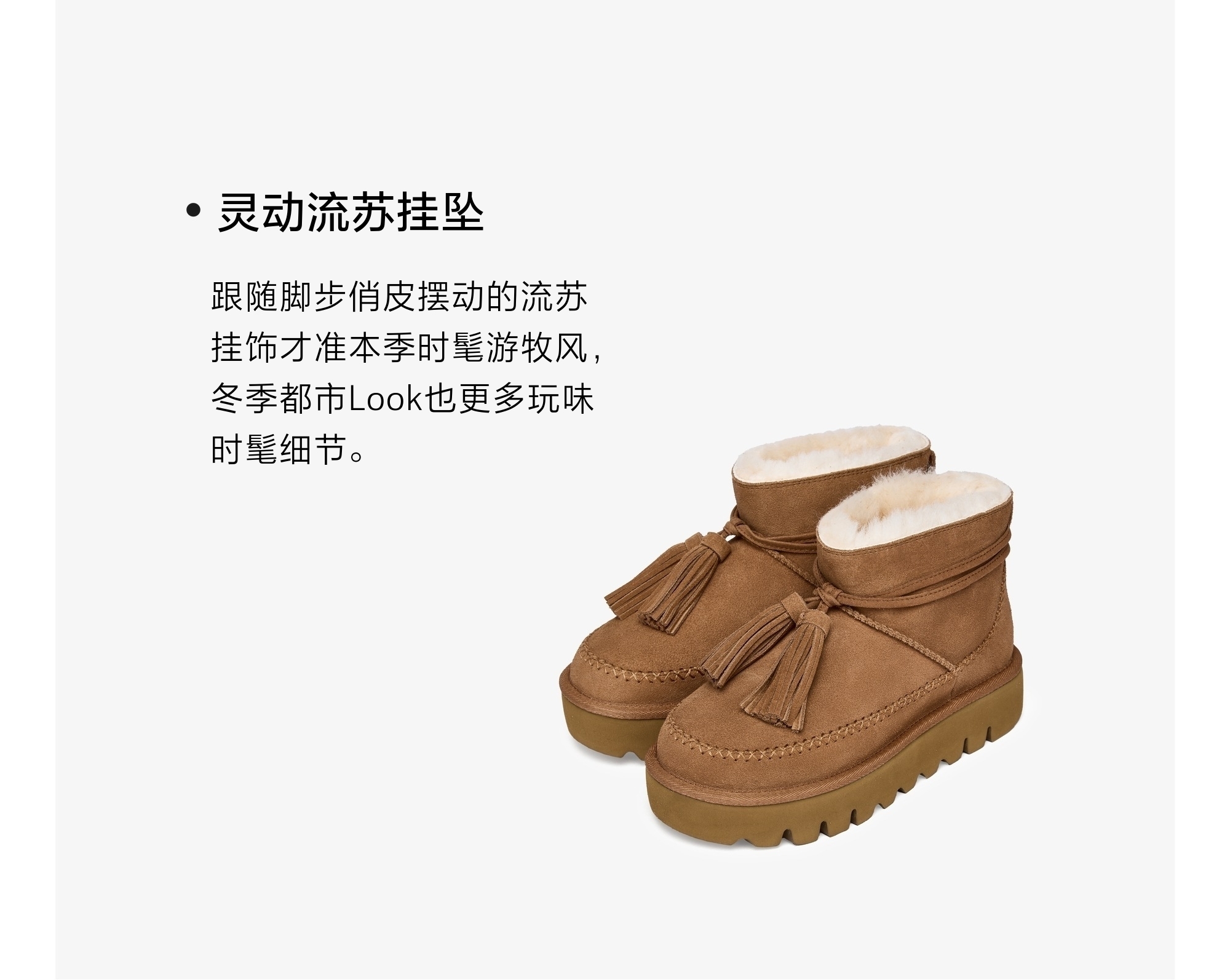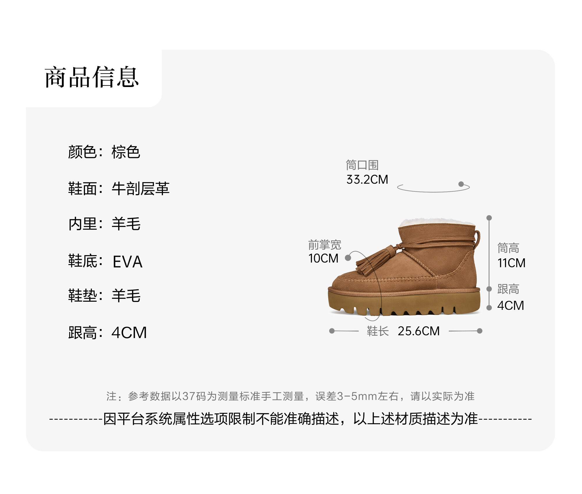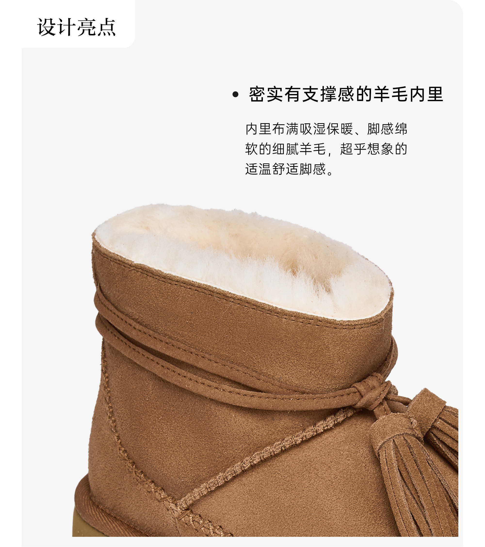 | 鞋垫材质:羊毛 | 皮质特征:牛剖层革 | 防水台高度:无 | 鞋类流行款式:雪地靴 |