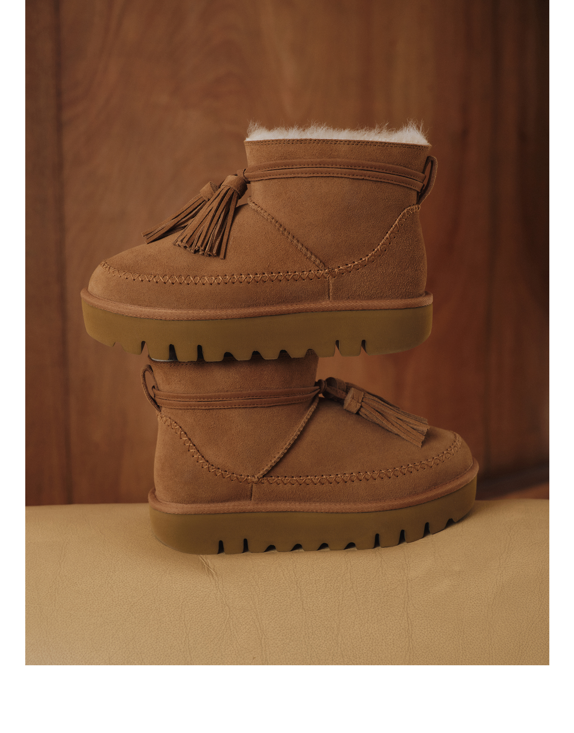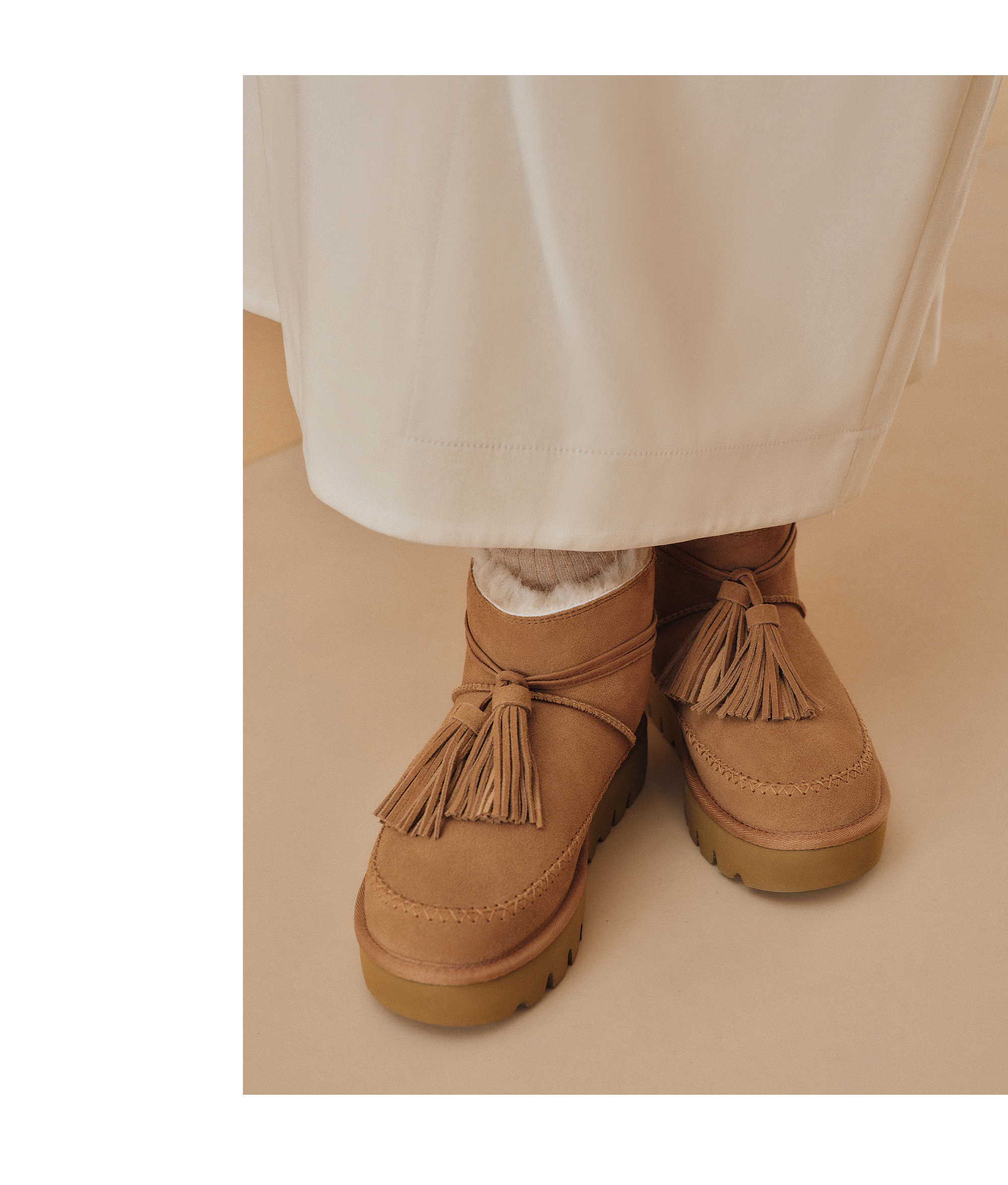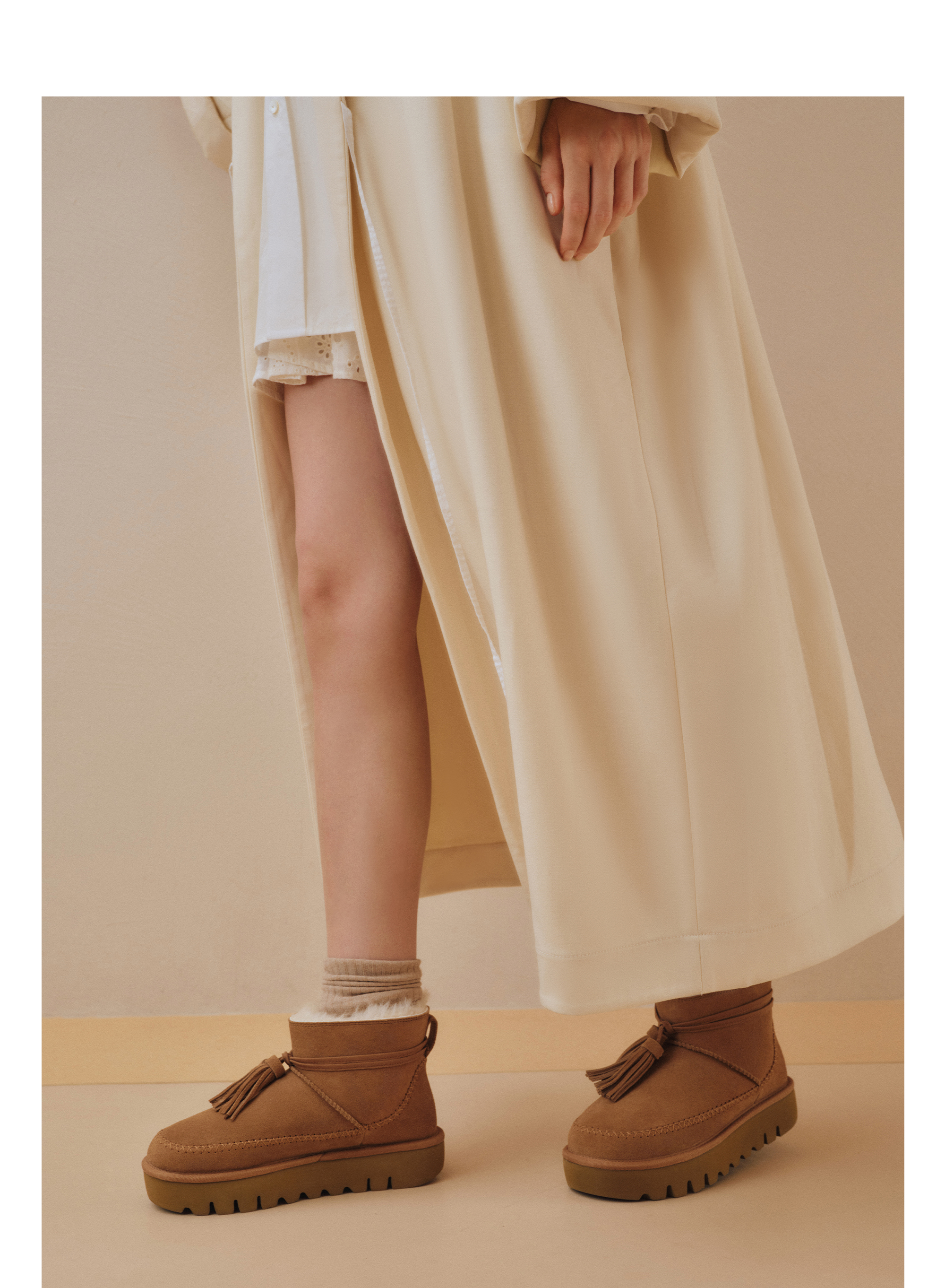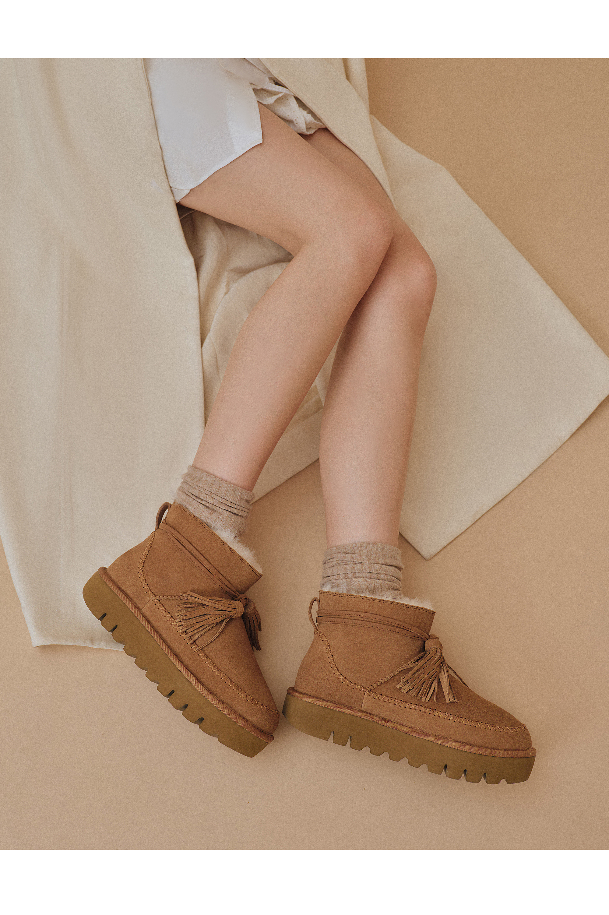| 鞋面内里材质:羊毛 | 色系:棕色 | 跟高数值:4CM | 配跟:无 | 帮面材质:牛剖层革 |