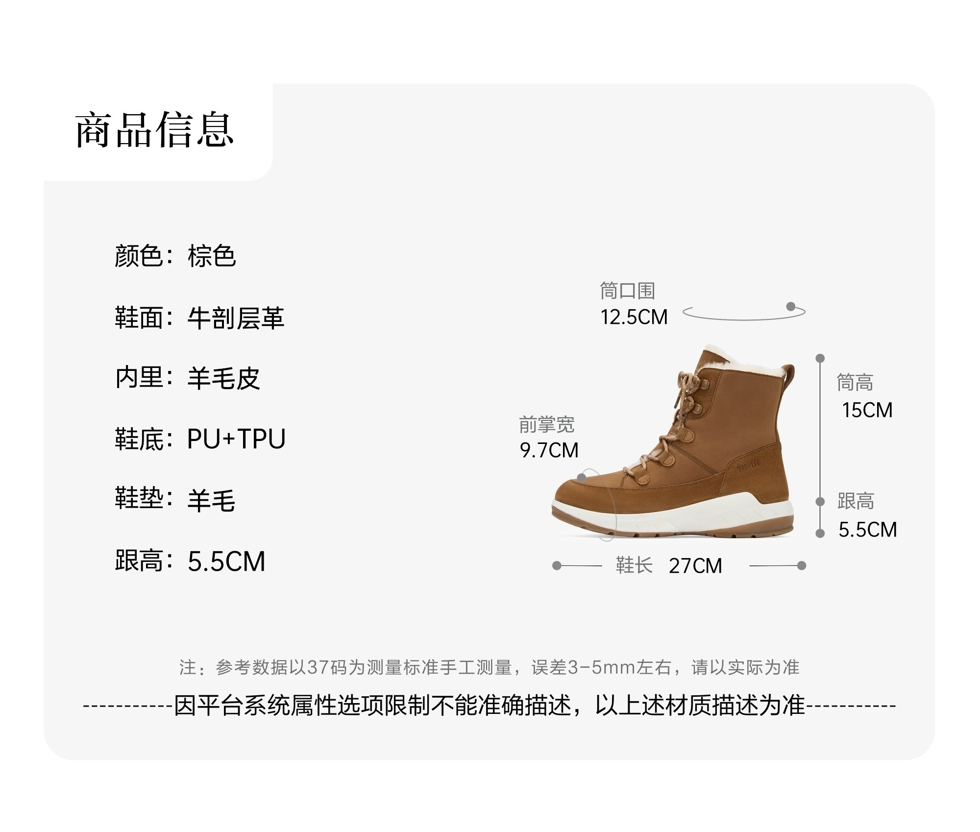 | 参考鞋宽(女):9.5CM | 风格:休闲 | 鞋面内里材质:猪皮革 | 色系:棕色 | 跟高数值:5.5CM |
