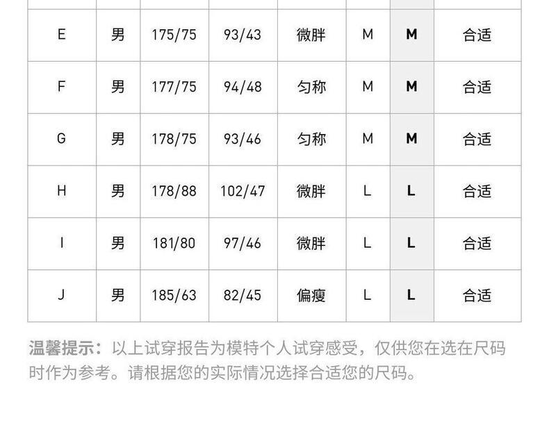 | 身高 | 170 | 174 | 177 | 180 | 183 | 186 | 189 |
