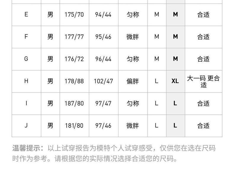 | 身高 | 170 | 174 | 177 | 180 | 183 | 186 | 189 |