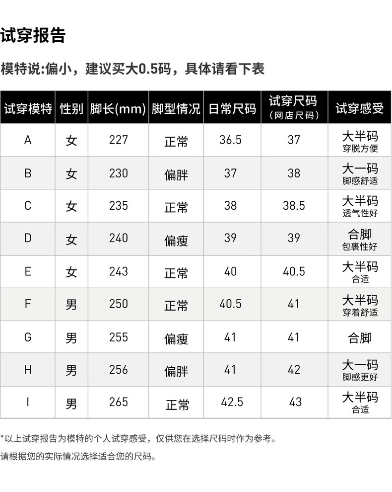 | 中国码(CHN) | 21.5 | 22 | 22.5 | 23 | 23.5 | 23.5 | 24 | 24.5 | 25 | 25.5 | 26 | 26.5 | 26.5 | 27 | 27.5 | 28 | 28.5 | 29 | 29 |