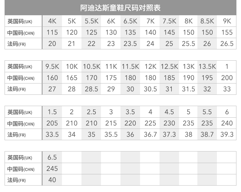 | 英国码(UK) | 12.5K | 13K | 13.5K | 1 | 1.5 | 2 | 2.5 | 3 | 3.5 | 4 | 4.5 | 5 | 5.5 | 6 | 6.5 | ||
