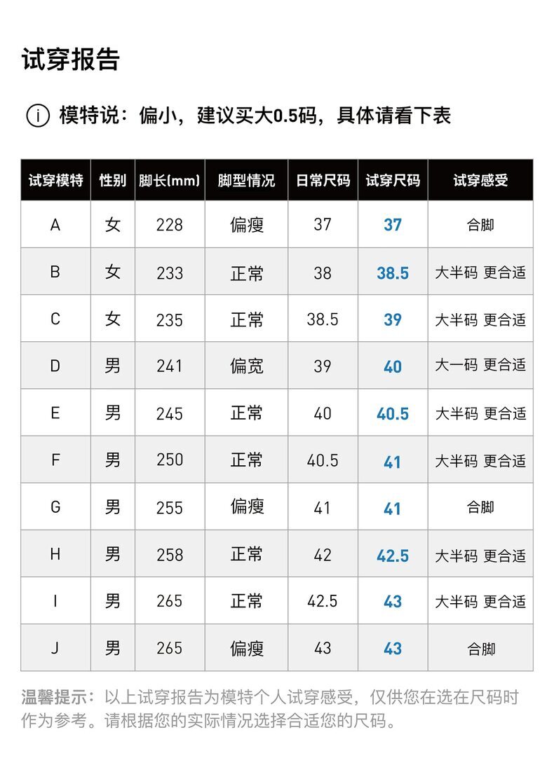 | 中国码(CHN) | 21.5 | 22 | 22.5 | 23 | 23.5 | 23.5 | 24 | 24.5 | 25 | 25.5 | 26 | 26.5 | 26.5 | 27 | 27.5 | 28 | 28.5 | 29 | 29 |