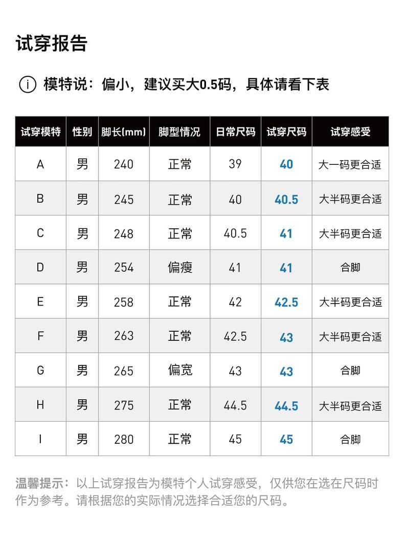 | 中国码(CHN) | 21.5 | 22 | 22.5 | 23 | 23.5 | 23.5 | 24 | 24.5 | 25 | 25.5 | 26 | 26.5 | 26.5 | 27 | 27.5 | 28 | 28.5 | 29 | 29 |