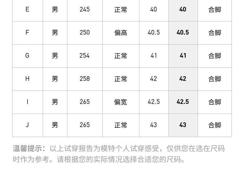 | 中国码(CHN) | 21.5 | 22 | 22.5 | 23 | 23.5 | 23.5 | 24 | 24.5 | 25 | 25.5 | 26 | 26.5 | 26.5 | 27 | 27.5 | 28 | 28.5 | 29 | 29 |