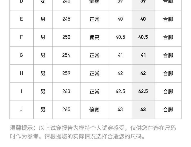 | 中国码(CHN) | 21.5 | 22 | 22.5 | 23 | 23.5 | 23.5 | 24 | 24.5 | 25 | 25.5 | 26 | 26.5 | 26.5 | 27 | 27.5 | 28 | 28.5 | 29 | 29 |