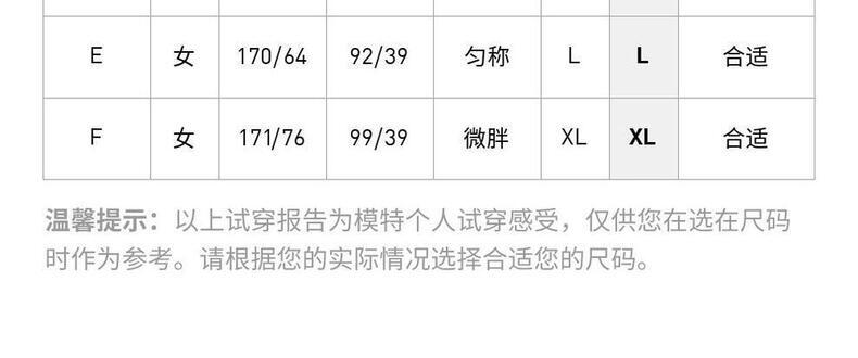 | 身高/腰围 | 165/54A | 165/58A | 165/62A | 170/66A | 170/70A | 170/74A | 175/78A |