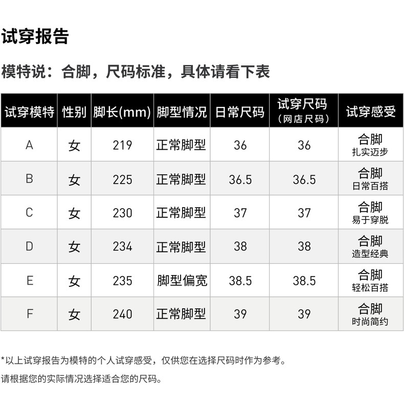 | 中国码(CHN) | 21.5 | 22 | 22.5 | 23 | 23.5 | 23.5 | 24 | 24.5 | 25 | 25.5 | 26 | 26.5 | 26.5 | 27 | 27.5 | 28 | 28.5 | 29 | 29 |