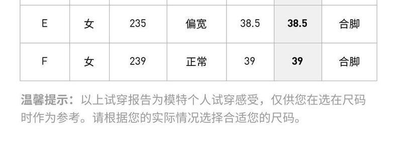 | 法码(FR) | 35.5 | 36 | 36.5 | 37 | 38 | 38.5 | 39 | 40 | 40.5 | 41 | 42 | 42.5 | 43 | 44 | 44.5 | 45 | 46 | 46.5 | 47 |