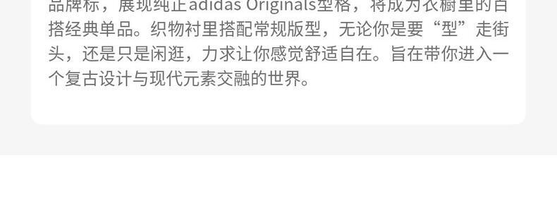 Originals(三叶草),adidas品牌旗下的运动经典系列,在全球各地有众多的追求者和拥有者。该系列以三叶草为标志,如同地球立体三维的平面展开,像一张世界地图,象征着三条纹延伸至全世界。这一系列大量运用20世纪40年代到80年代的元素作为设计灵感,具有强烈的复古感。adidas Originals是对阿迪达斯经典产品的传承。