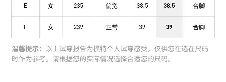 | 法码(FR) | 35.5 | 36 | 36.5 | 37 | 38 | 38.5 | 39 | 40 | 40.5 | 41 | 42 | 42.5 | 43 | 44 | 44.5 | 45 | 46 | 46.5 | 47 |