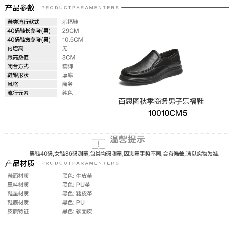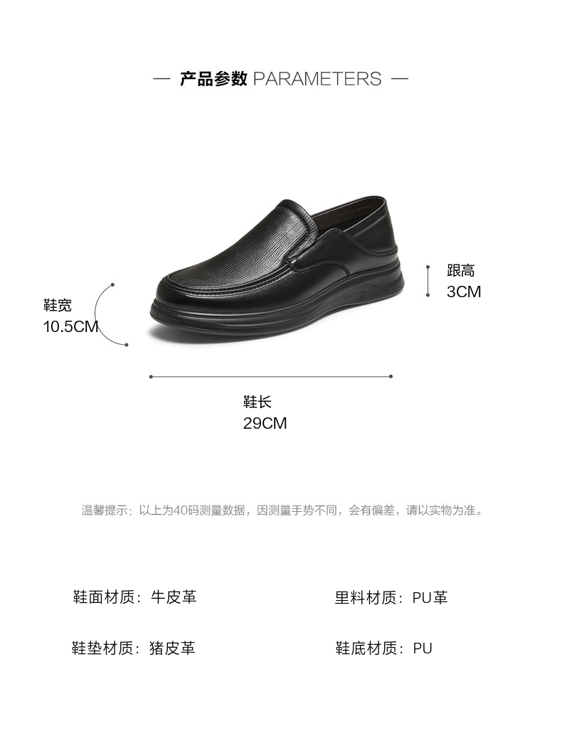 | 风格:商务 | 色系:黑色 | 跟高数值:3CM | 40码鞋宽参考(男):10.5CM | 性别:男子 |