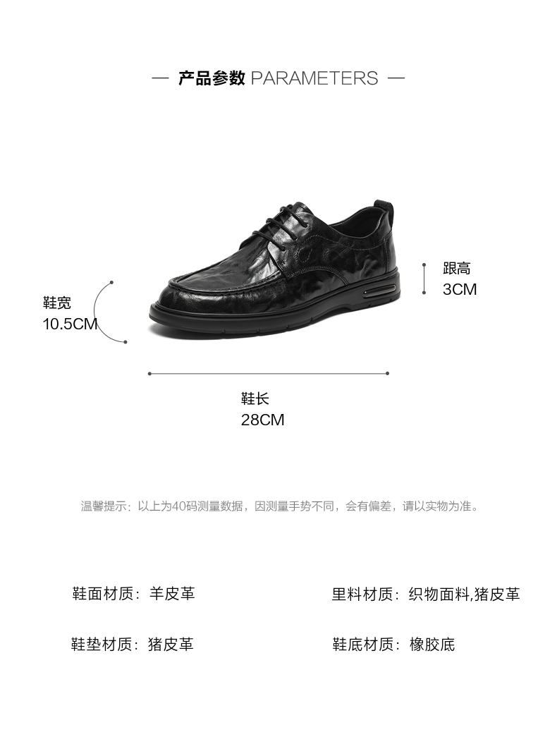 | 风格:正装 | 色系:黑色 | 跟高数值:3CM | 40码鞋宽参考(男):10.5CM | 性别:男子 |