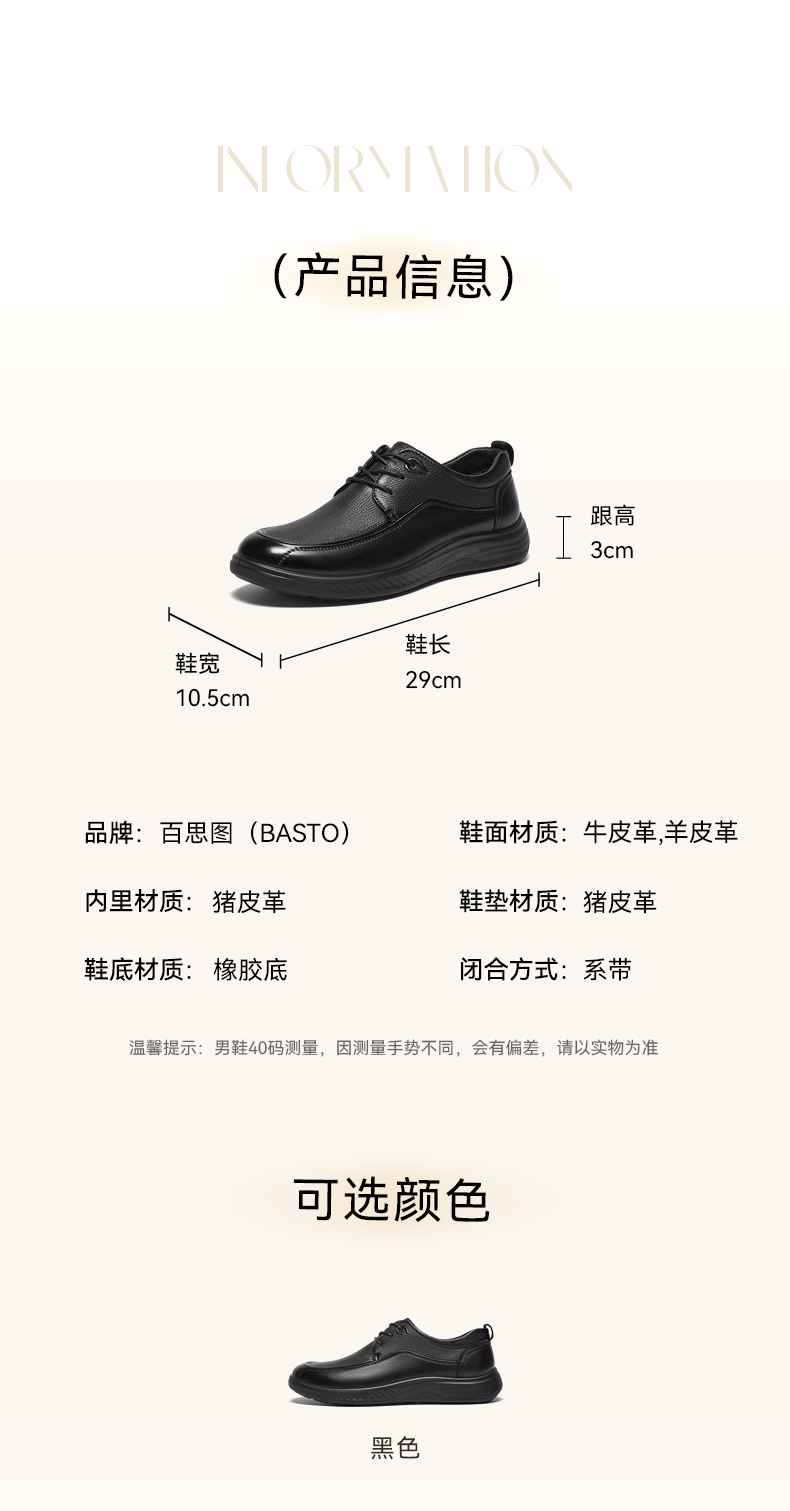 | 风格:商务 | 色系:黑色 | 跟高数值:3CM | 40码鞋宽参考(男):10.5CM | 性别:男子 |