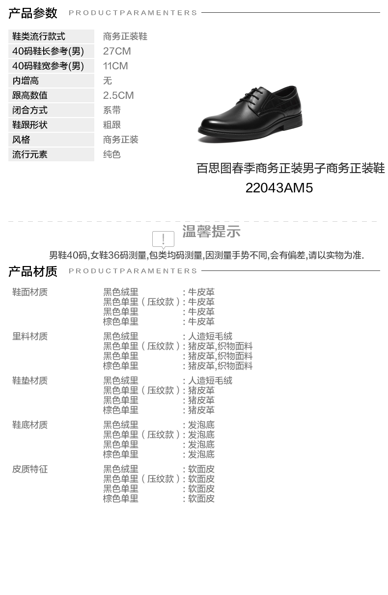 | 风格:商务正装 | 色系:黑色 | 跟高数值:2.5CM | 40码鞋宽参考(男):11CM | 性别:男子 |