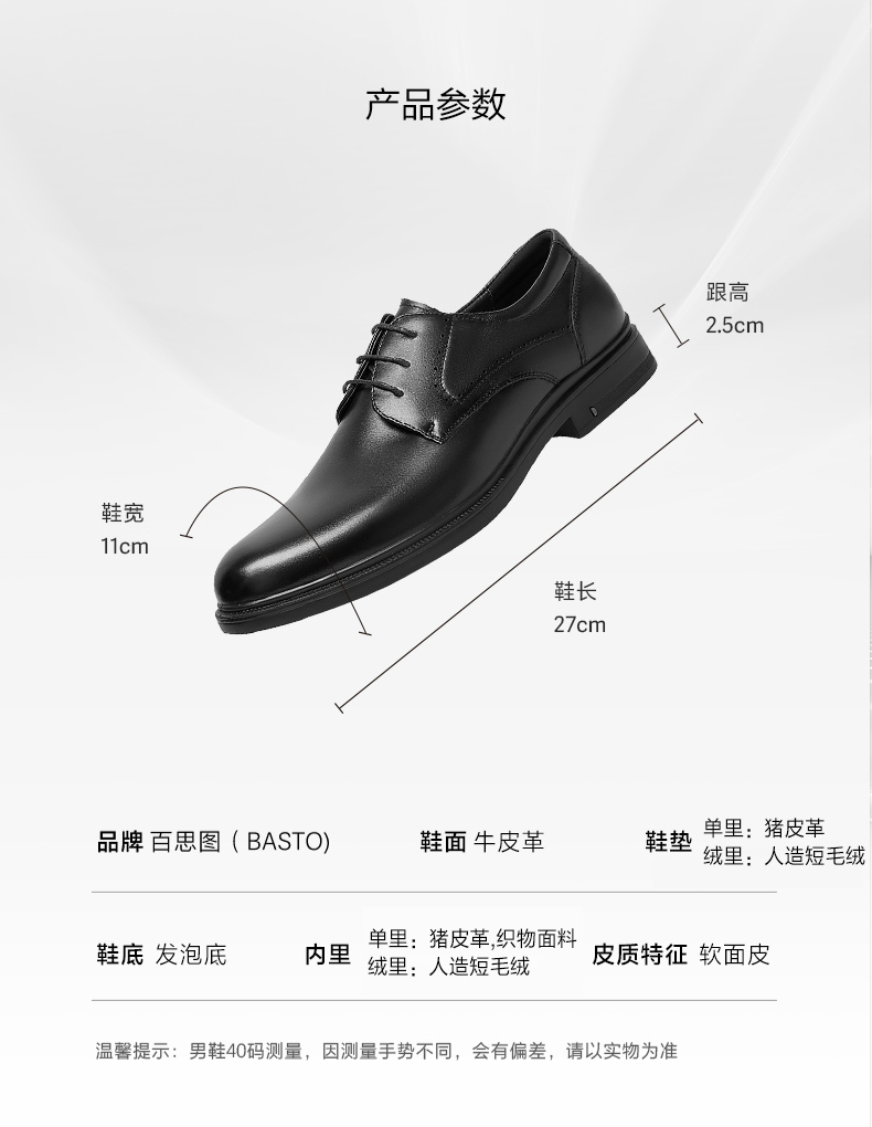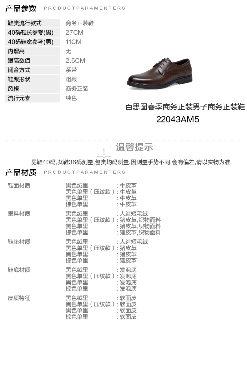 | 风格:商务正装 | 色系:棕色 | 跟高数值:2.5CM | 40码鞋宽参考(男):11CM | 性别:男子 |