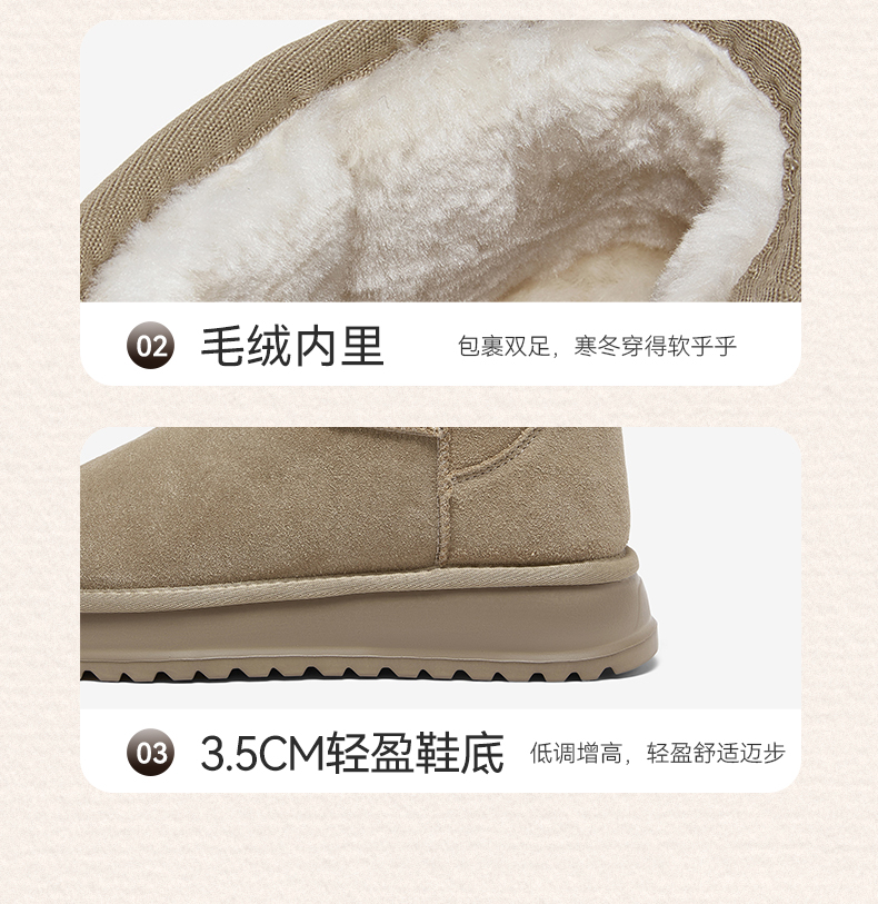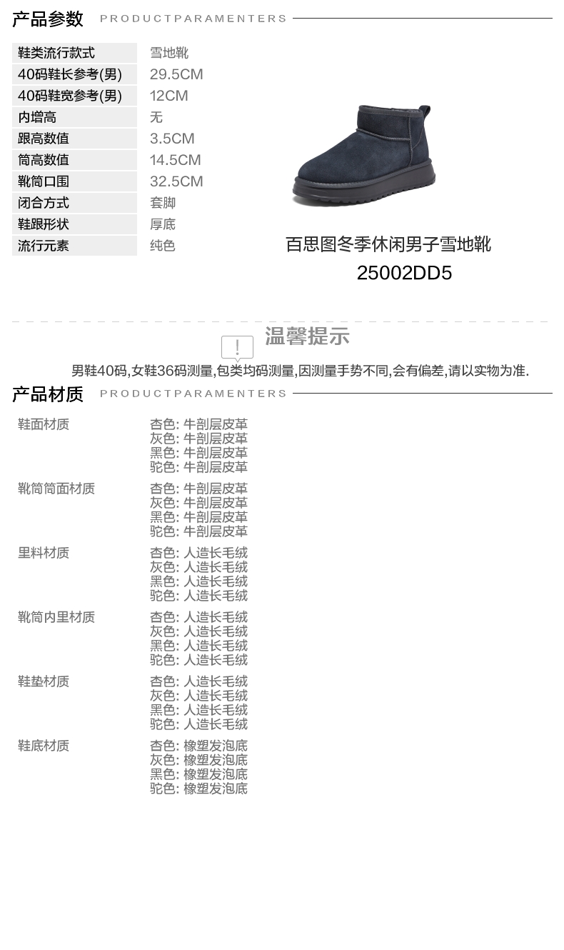 | 闭合方式:套脚 | 40码鞋宽参考(男):12CM | 靴筒口围:32.5CM | 上市时间:2025年冬季 | 鞋类流行款式:雪地靴 |