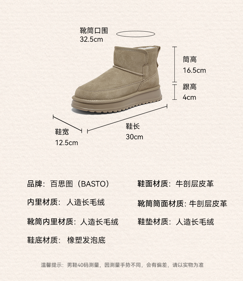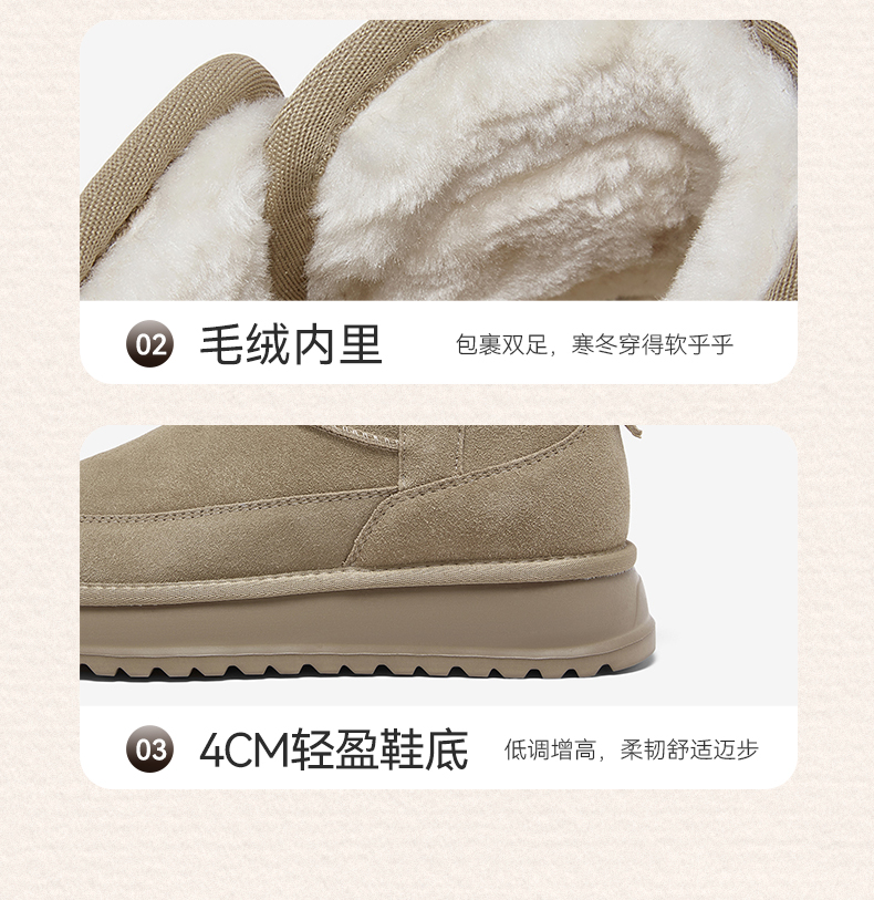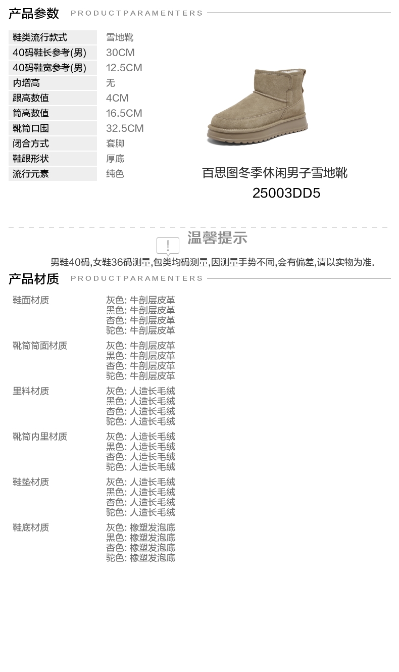 | 闭合方式:套脚 | 40码鞋宽参考(男):12.5CM | 靴筒口围:32.5CM | 上市时间:2025年冬季 | 鞋类流行款式:雪地靴 |