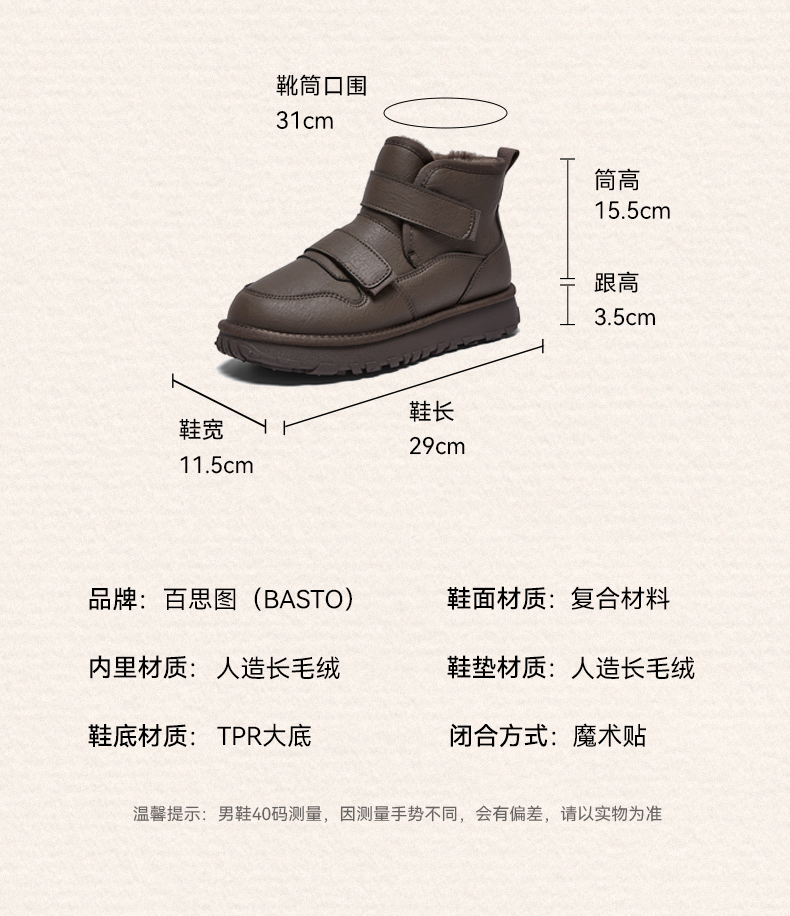 | 40码鞋长参考(男):29CM | 鞋底材质:TPR大底 | 靴筒内里材质:人造长毛绒 | 内增高:无 | 鞋面材质:复合材料 |