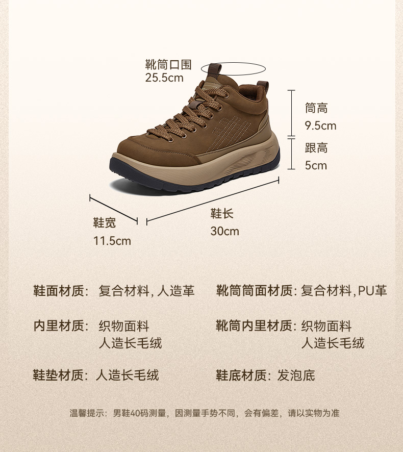 | 40码鞋长参考(男):30CM | 鞋底材质:发泡底 | 靴筒内里材质:人造长毛绒织物面料 | 内增高:无 | 鞋面材质:人造革复合材料 |