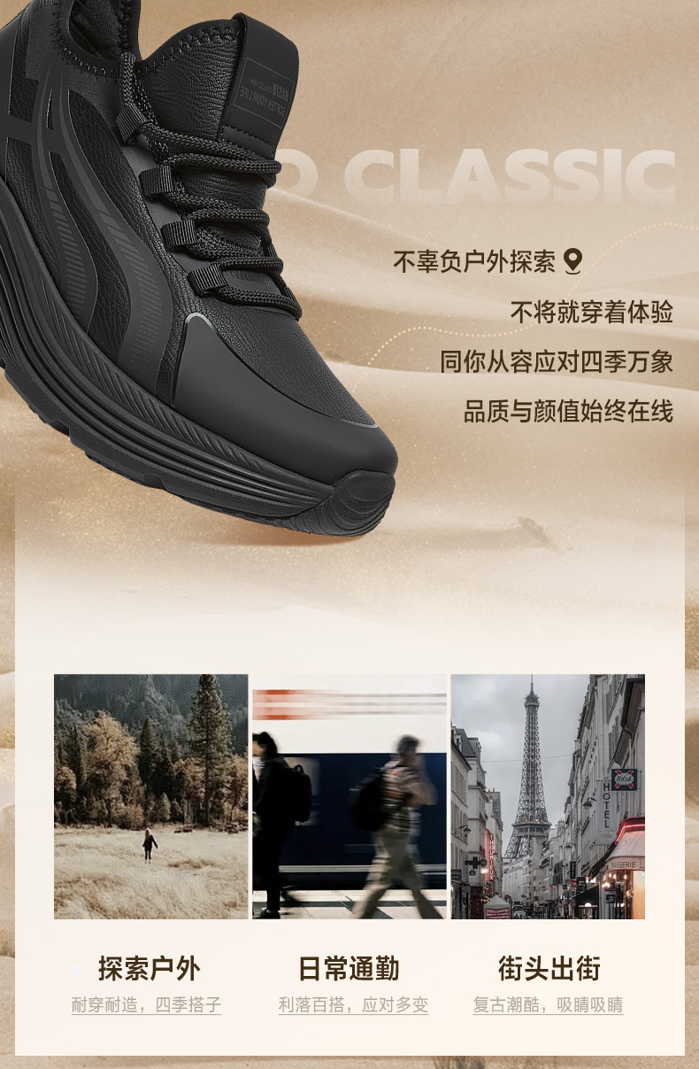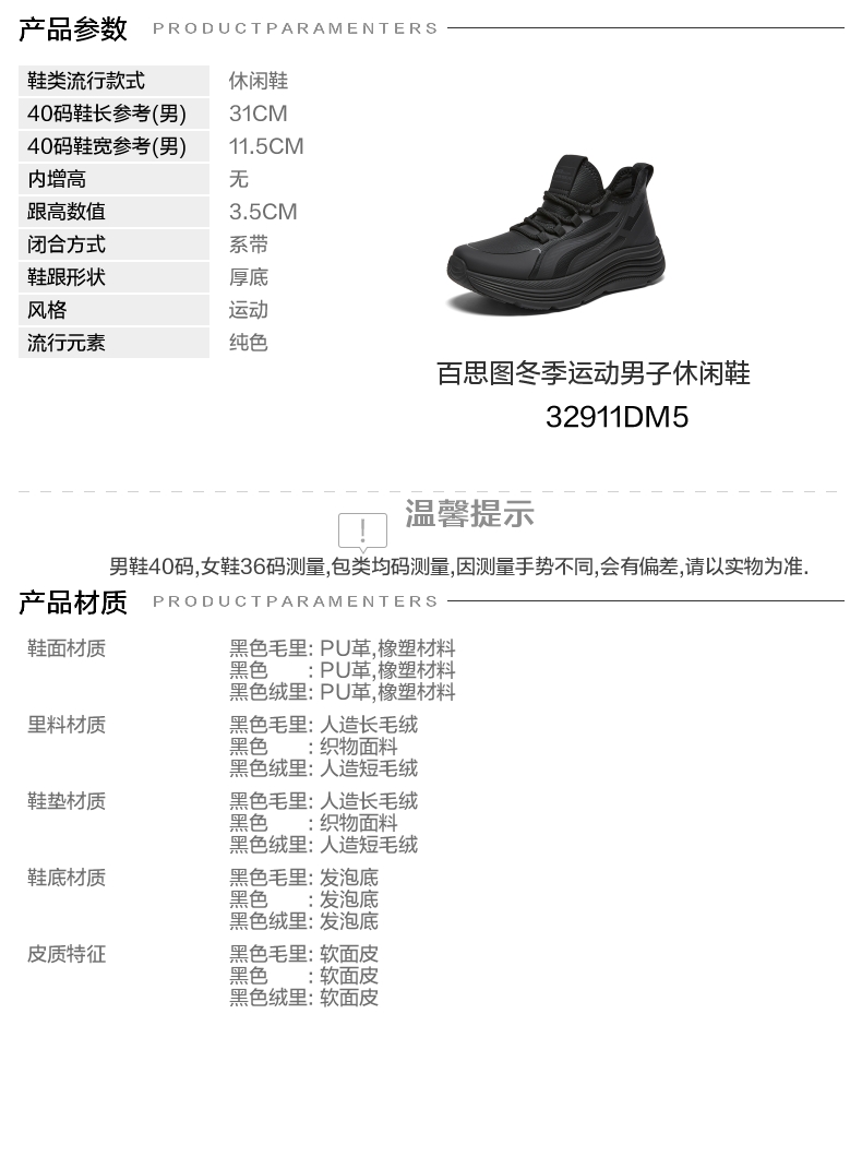 | 风格:运动 | 色系:黑色 | 跟高数值:3.5CM | 40码鞋宽参考(男):11.5CM | 性别:男子 |
