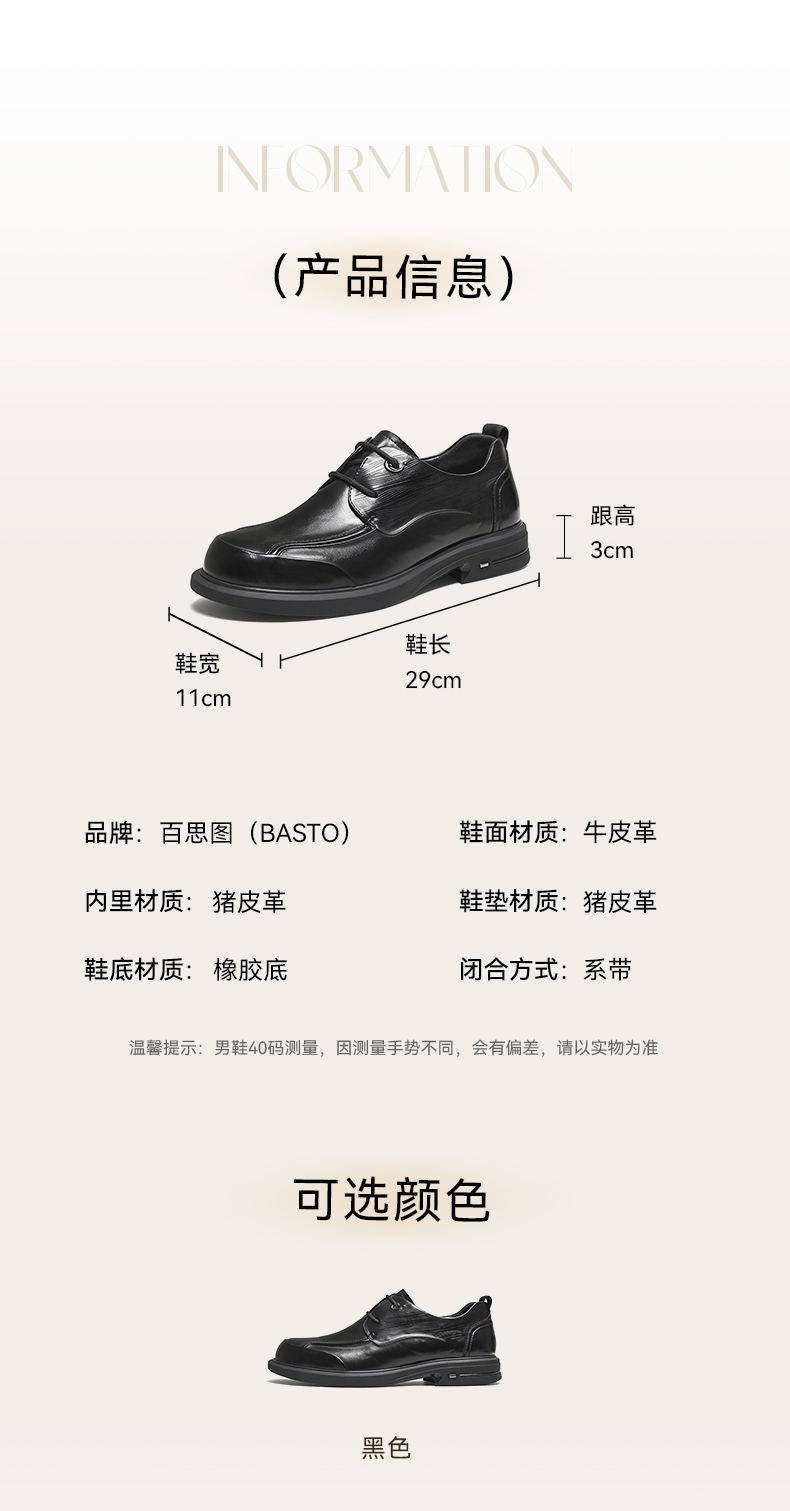 | 风格:商务 | 色系:黑色 | 跟高数值:3CM | 40码鞋宽参考(男):11CM | 性别:男子 |