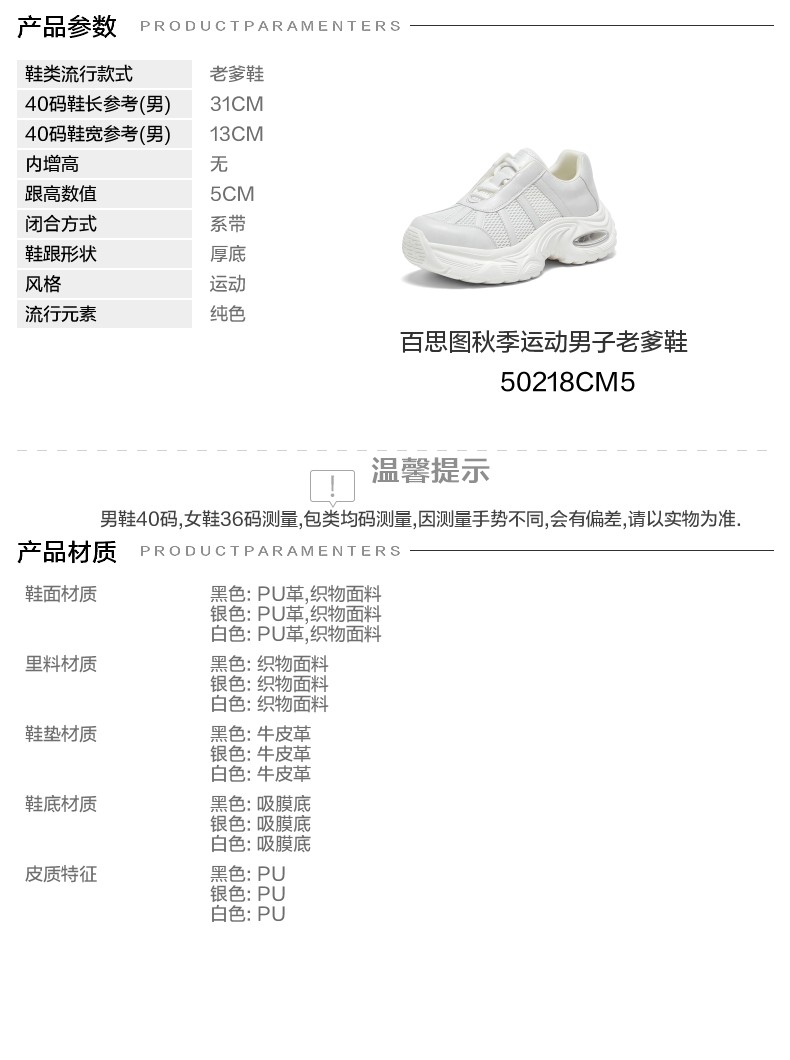 | 风格:运动 | 色系:白色 | 跟高数值:5CM | 40码鞋宽参考(男):13CM | 性别:男子 |