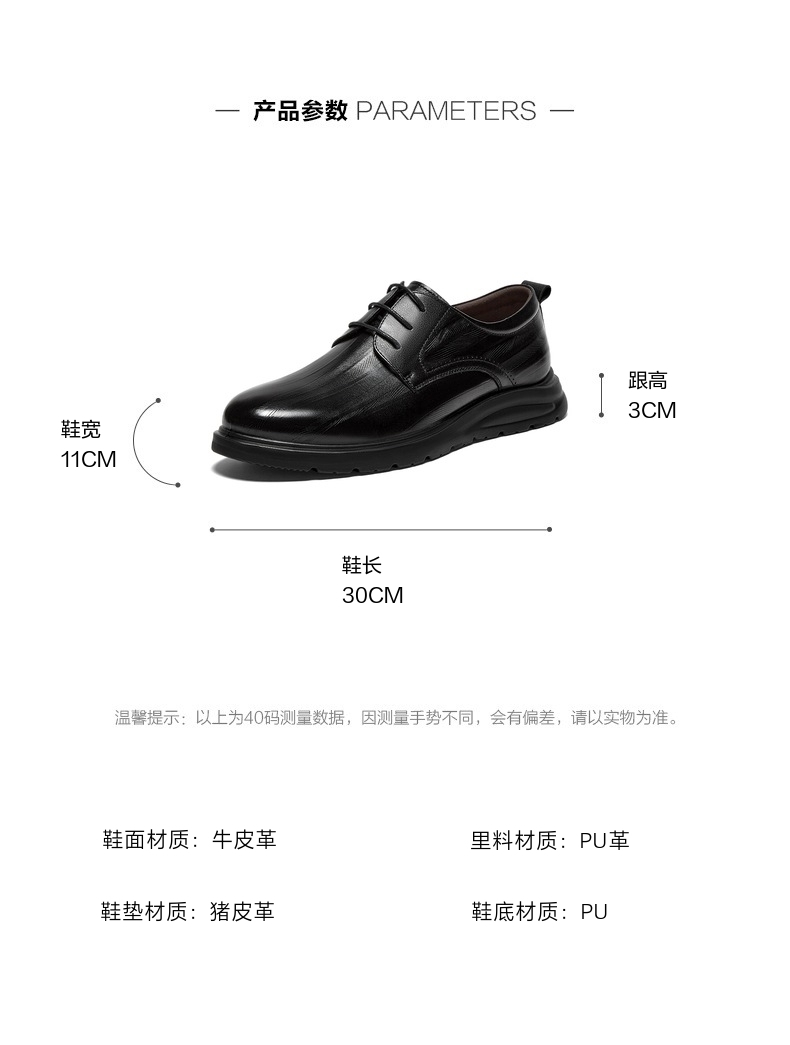 风格:商务 色系:黑色 跟高数值:3CM 40码鞋宽参考(男):11CM 性别:男子
