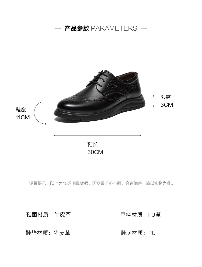 | 风格:商务 | 色系:黑色 | 跟高数值:3CM | 40码鞋宽参考(男):11CM | 性别:男子 |