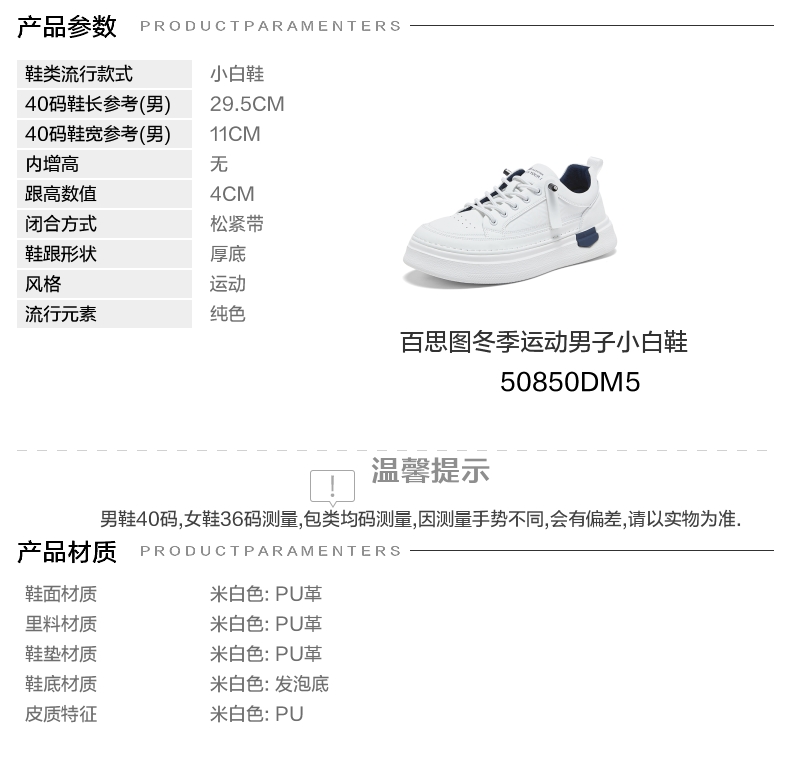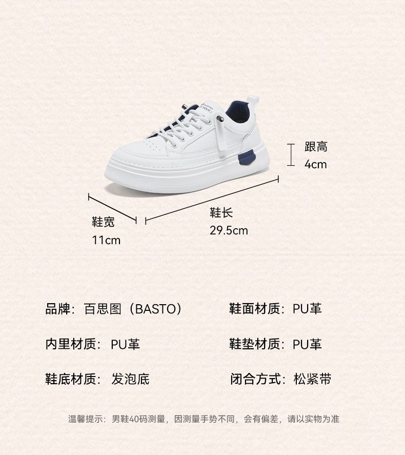 | 风格:运动 | 色系:白色 | 跟高数值:4CM | 40码鞋宽参考(男):11CM | 性别:男子 |