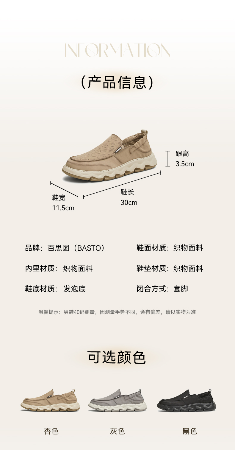 | 鞋面材质:织物面料 | 适用场合:日常休闲 | 闭合方式:套脚 | 所在区域:电子商务 | 40码鞋宽参考(男):11.5CM |