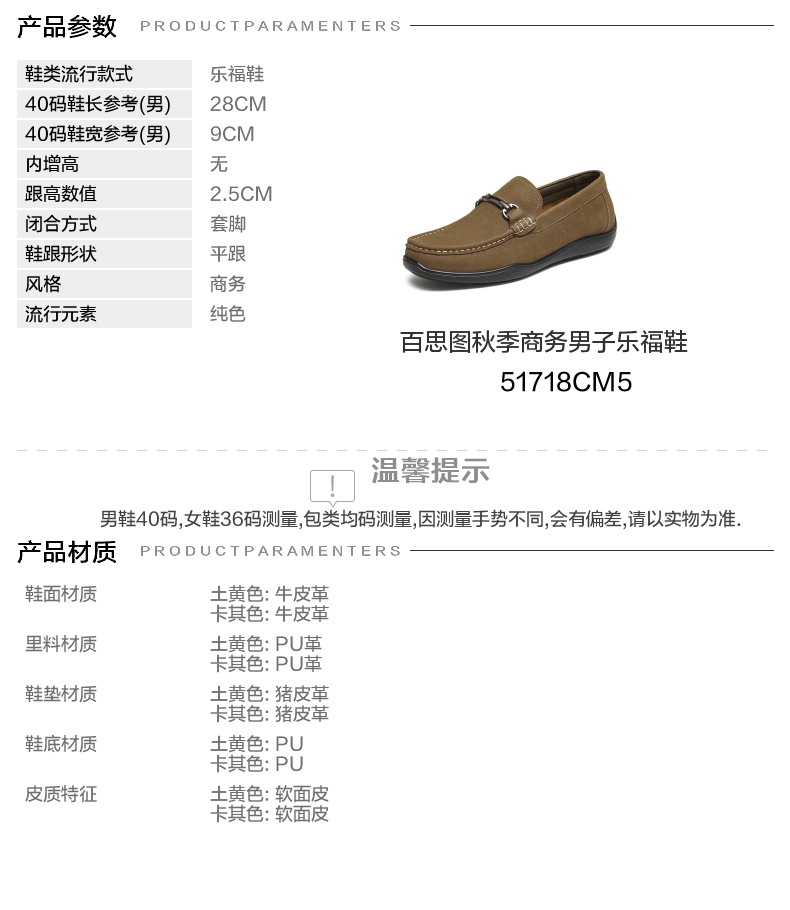 | 风格:商务 | 色系:卡其 | 跟高数值:2.5CM | 40码鞋宽参考(男):9CM | 性别:男子 |