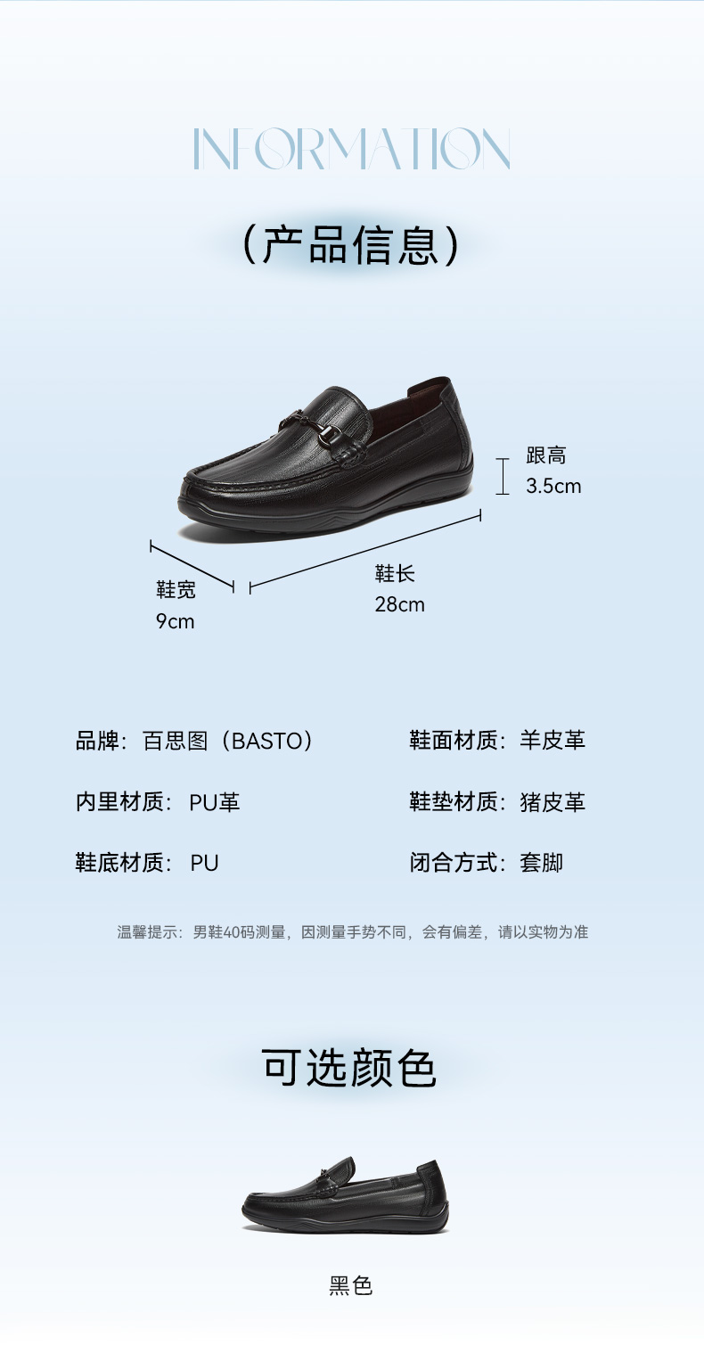| 风格:商务 | 色系:黑色 | 跟高数值:3.5CM | 40码鞋宽参考(男):9CM | 性别:男子 |