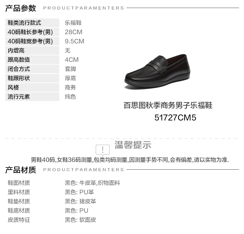 | 风格:商务 | 色系:黑色 | 跟高数值:4CM | 40码鞋宽参考(男):9.5CM | 性别:男子 |