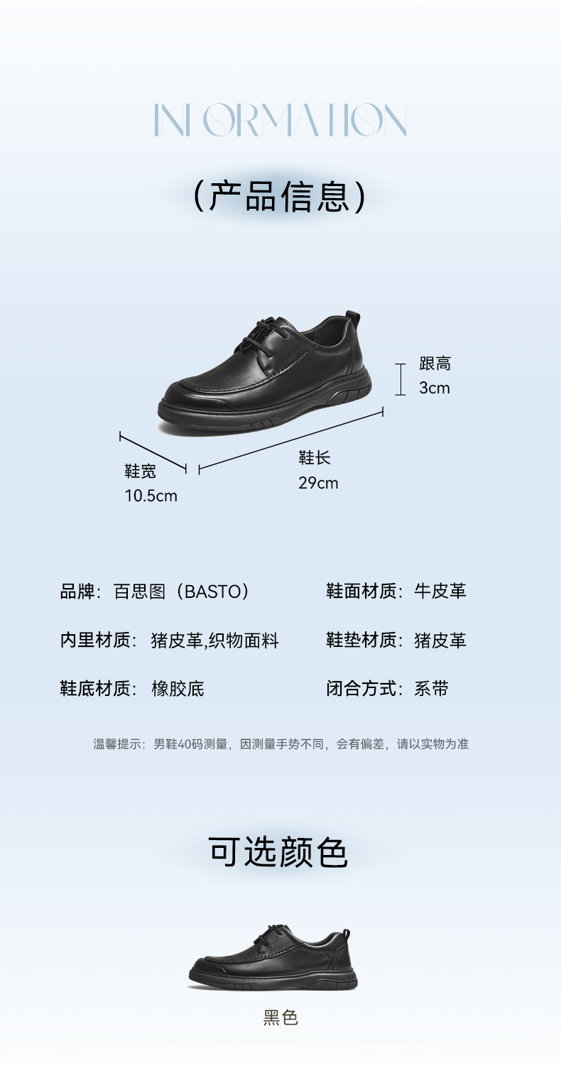 | 风格:商务 | 色系:黑色 | 跟高数值:3CM | 40码鞋宽参考(男):10.5CM | 性别:男子 |