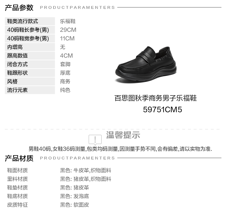 | 风格:商务 | 色系:黑色 | 跟高数值:4CM | 40码鞋宽参考(男):11CM | 性别:男子 |