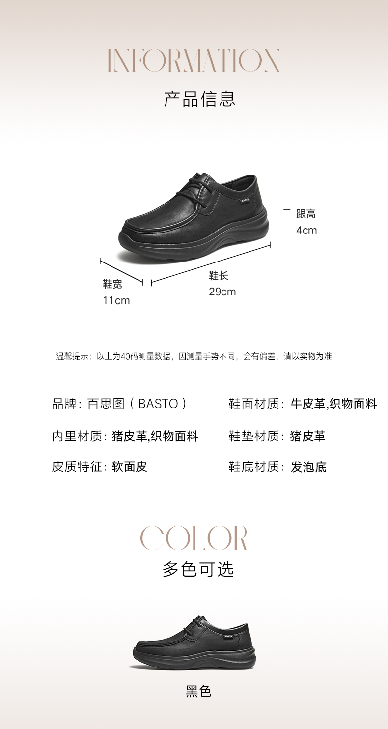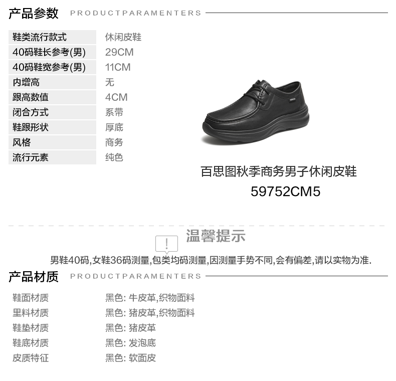 | 风格:商务 | 色系:黑色 | 跟高数值:4CM | 40码鞋宽参考(男):11CM | 性别:男子 |