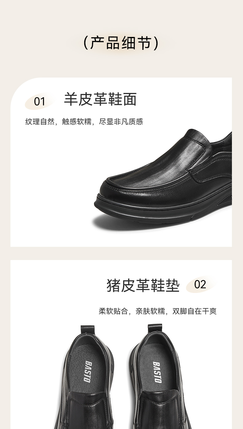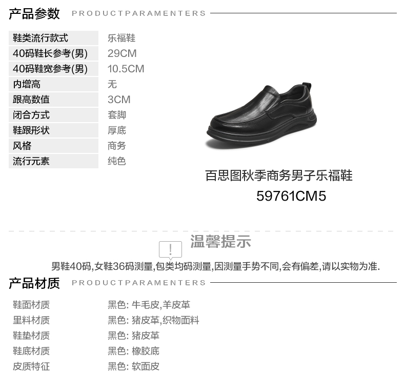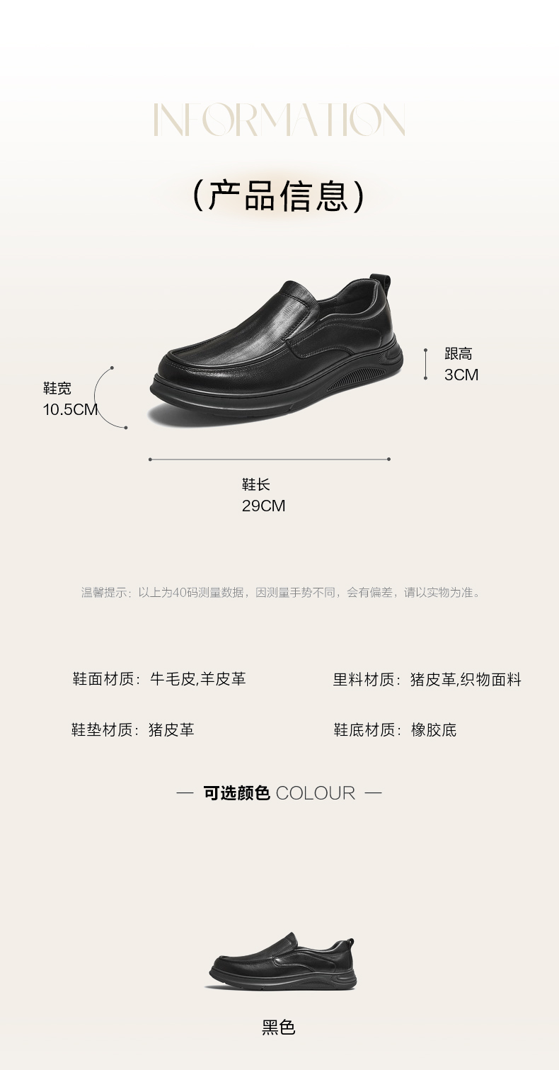 | 风格:商务 | 鞋面内里材质:猪皮革 | 色系:黑色 | 跟高数值:3CM | 40码鞋宽参考(男):10.5CM |