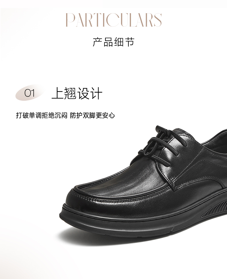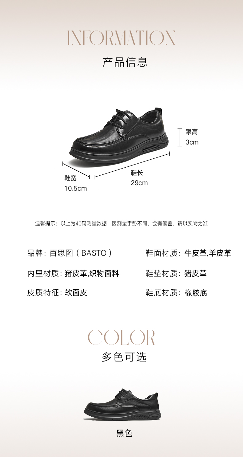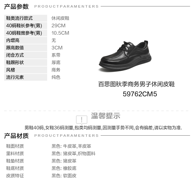 | 风格:商务 | 色系:黑色 | 跟高数值:3CM | 40码鞋宽参考(男):10.5CM | 性别:男子 |