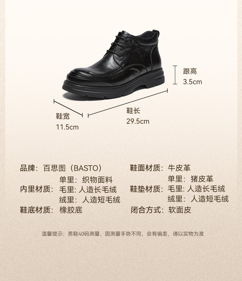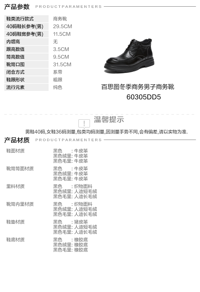 | 闭合方式:系带 | 40码鞋宽参考(男):11.5CM | 靴筒口围:31.5CM | 上市时间:2025年冬季 | 鞋类流行款式:商务靴 |