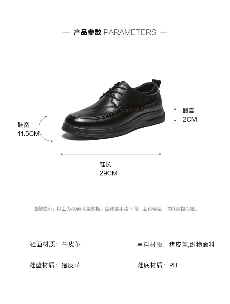 | 风格:商务 | 色系:黑色 | 跟高数值:2CM | 40码鞋宽参考(男):11.5CM | 性别:男子 |