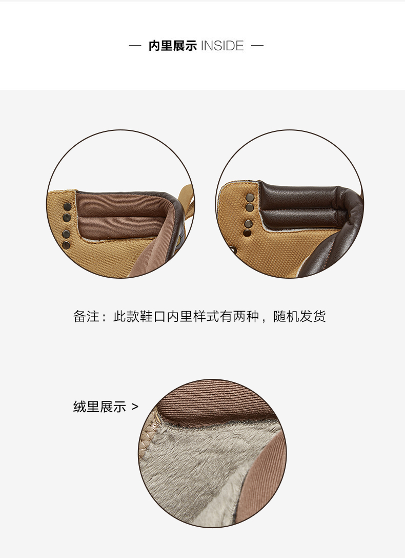 | 制鞋工艺:缝制鞋 | 款式季节:冬季 | 鞋垫材质:人造短毛绒 | 渠道划分:线下同步 | 皮质特征:软面皮 |