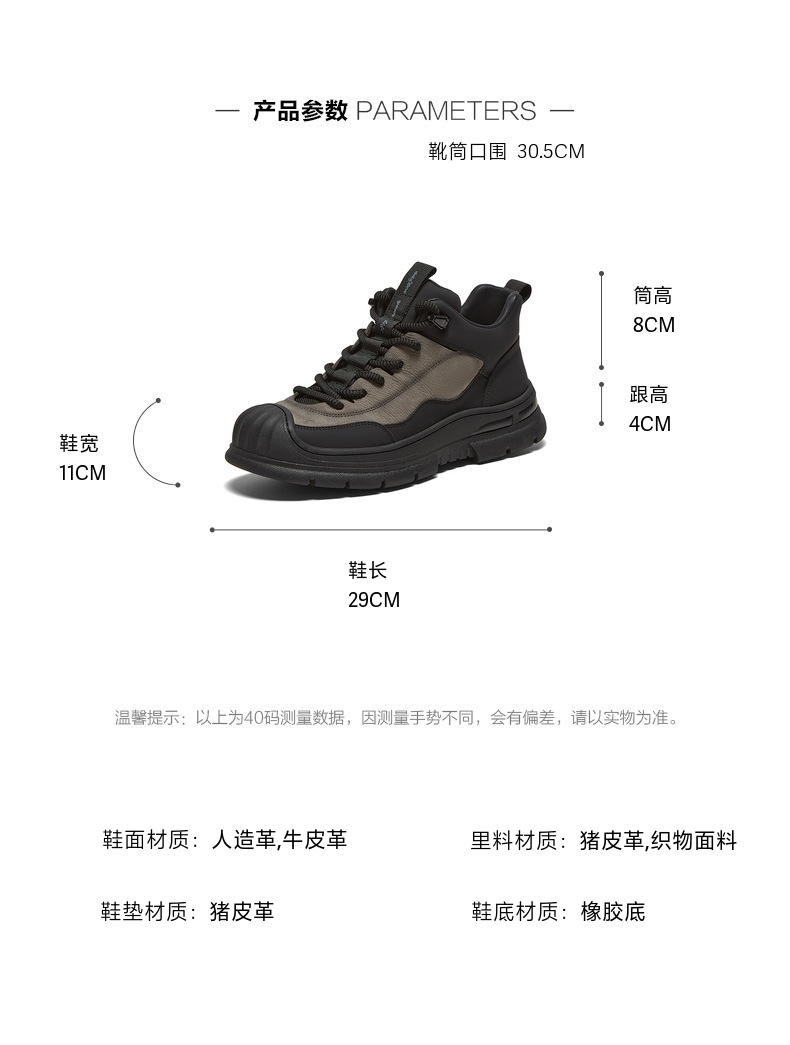 | 40码鞋长参考(男):29CM | 功能科技:防滑 | 鞋底材质:橡胶底 | 靴筒内里材质:织物面料猪皮革 | 内增高:无 |