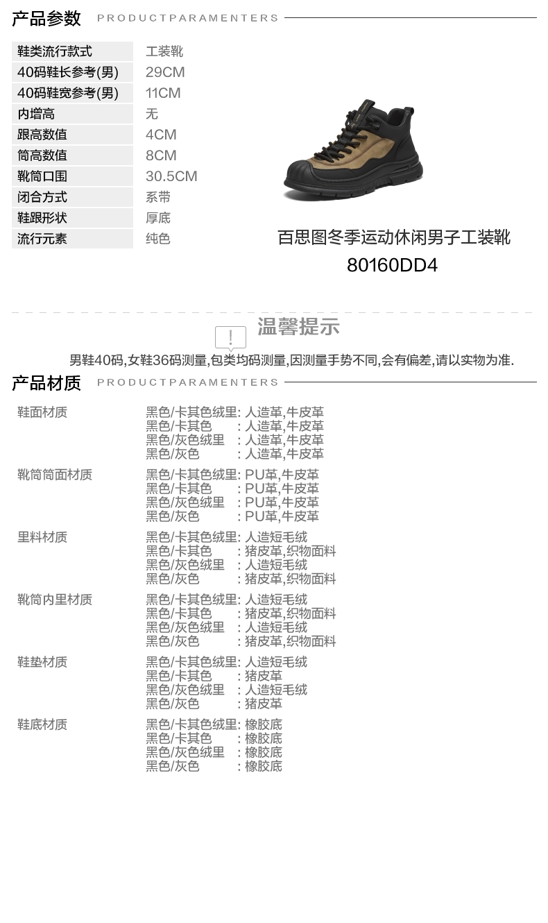 | 鞋类流行款式:工装靴 | 鞋头款式:圆头 | 执行标准:休闲鞋 QB/T2955-2017 | 鞋面图案:纯色 | 鞋跟形状:厚底 |