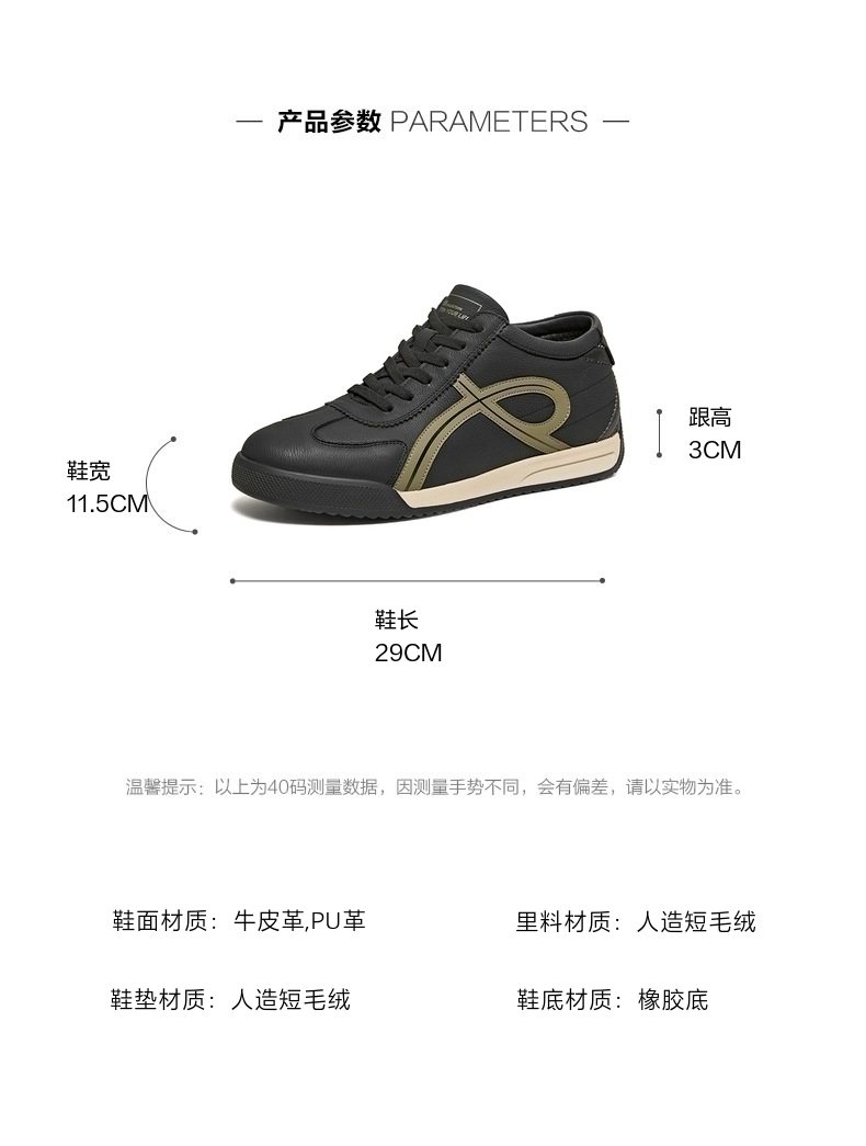 | 风格:运动 | 鞋面内里材质:猪皮革 | 色系:黑色 | 跟高数值:3CM | 40码鞋宽参考(男):11.5CM |