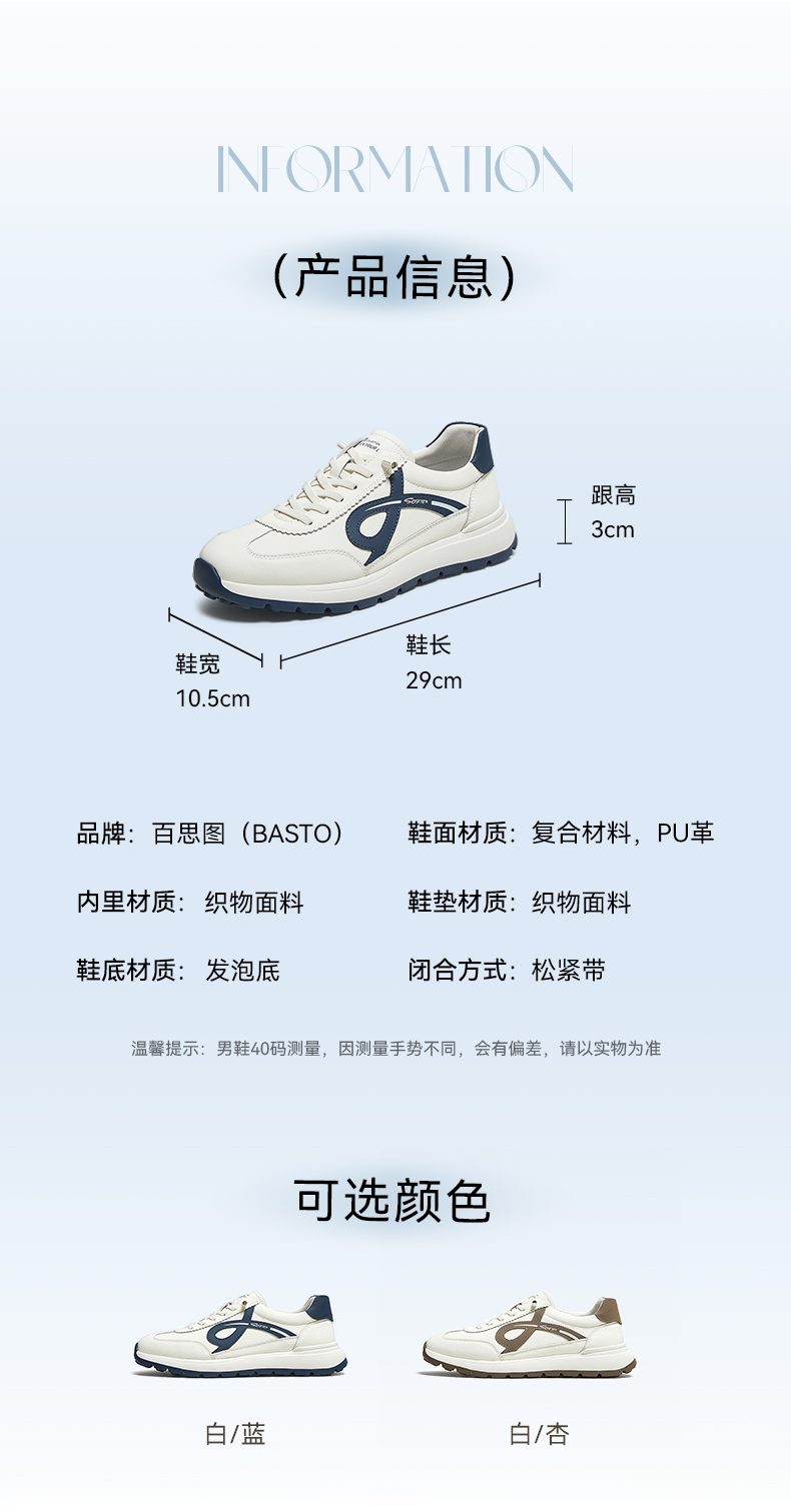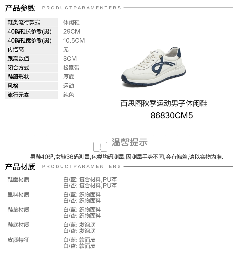 | 风格:运动 | 色系:白色 | 跟高数值:3CM | 40码鞋宽参考(男):10.5CM | 性别:男子 |