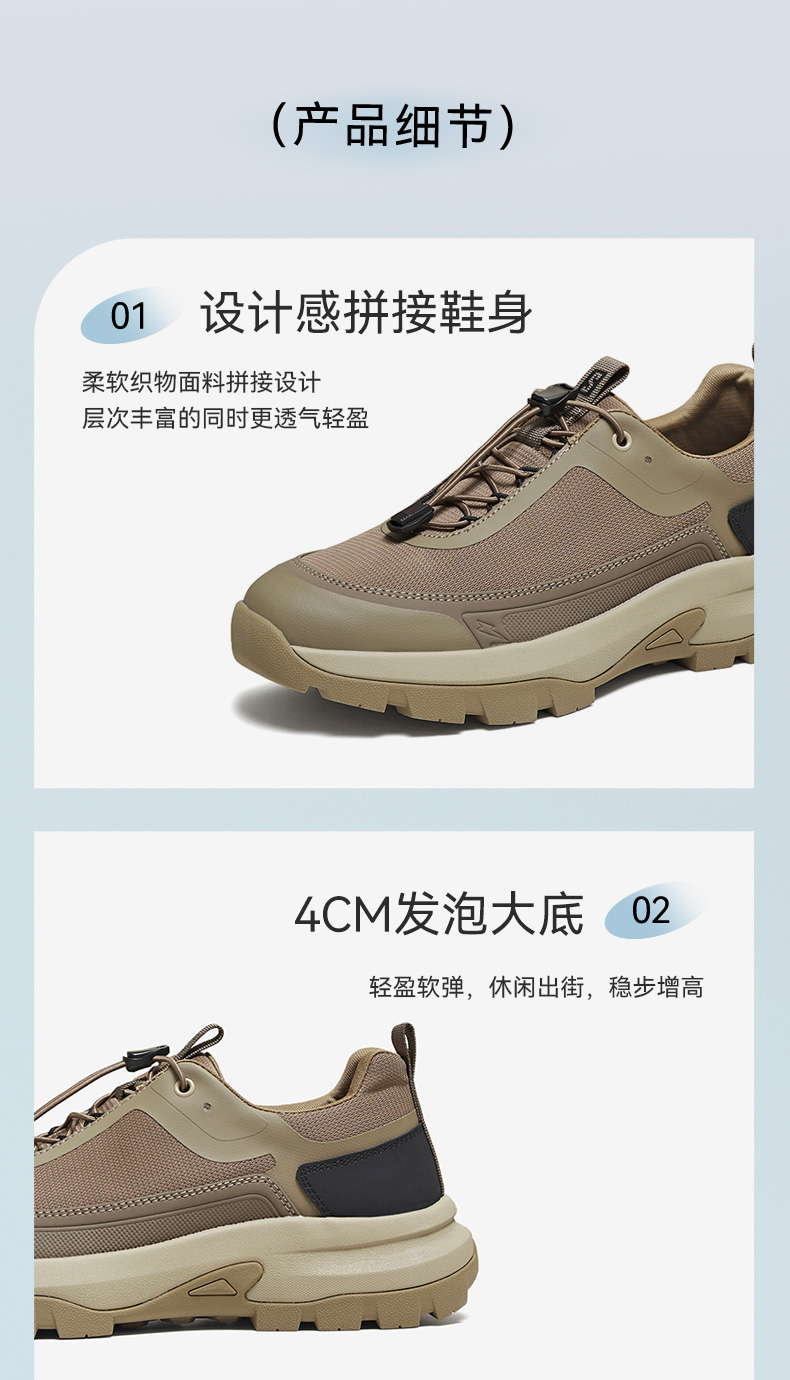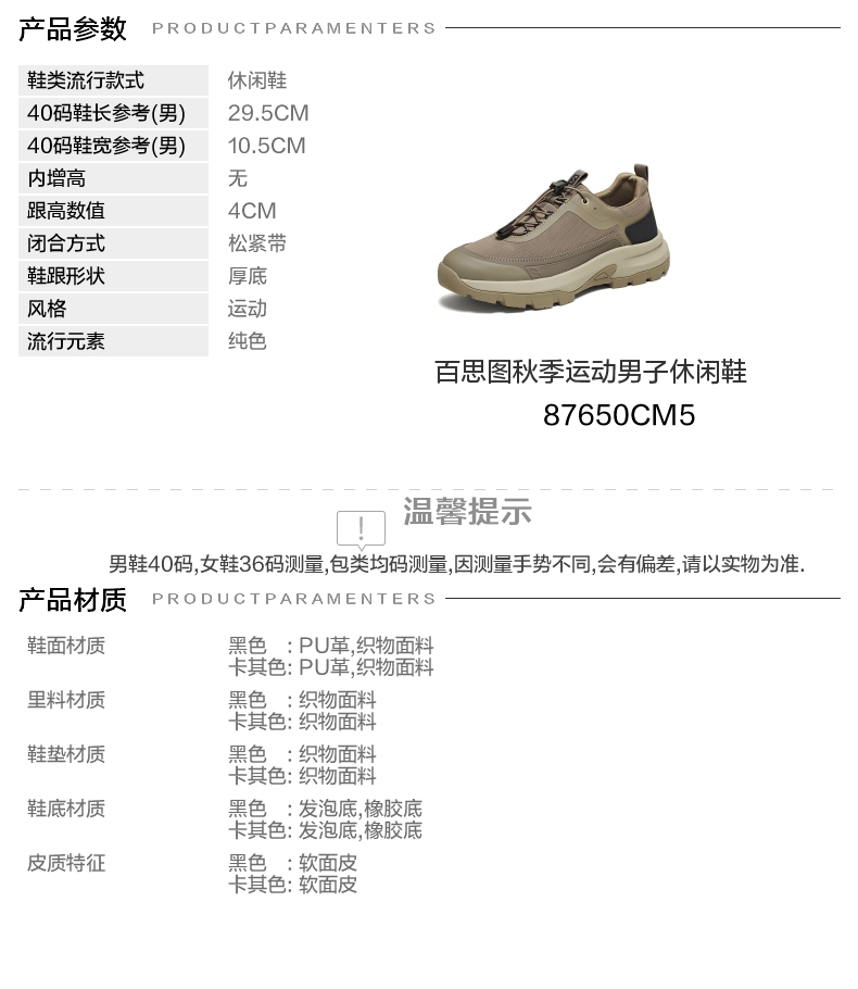 | 风格:运动 | 色系:卡其 | 跟高数值:4CM | 40码鞋宽参考(男):10.5CM | 性别:男子 |